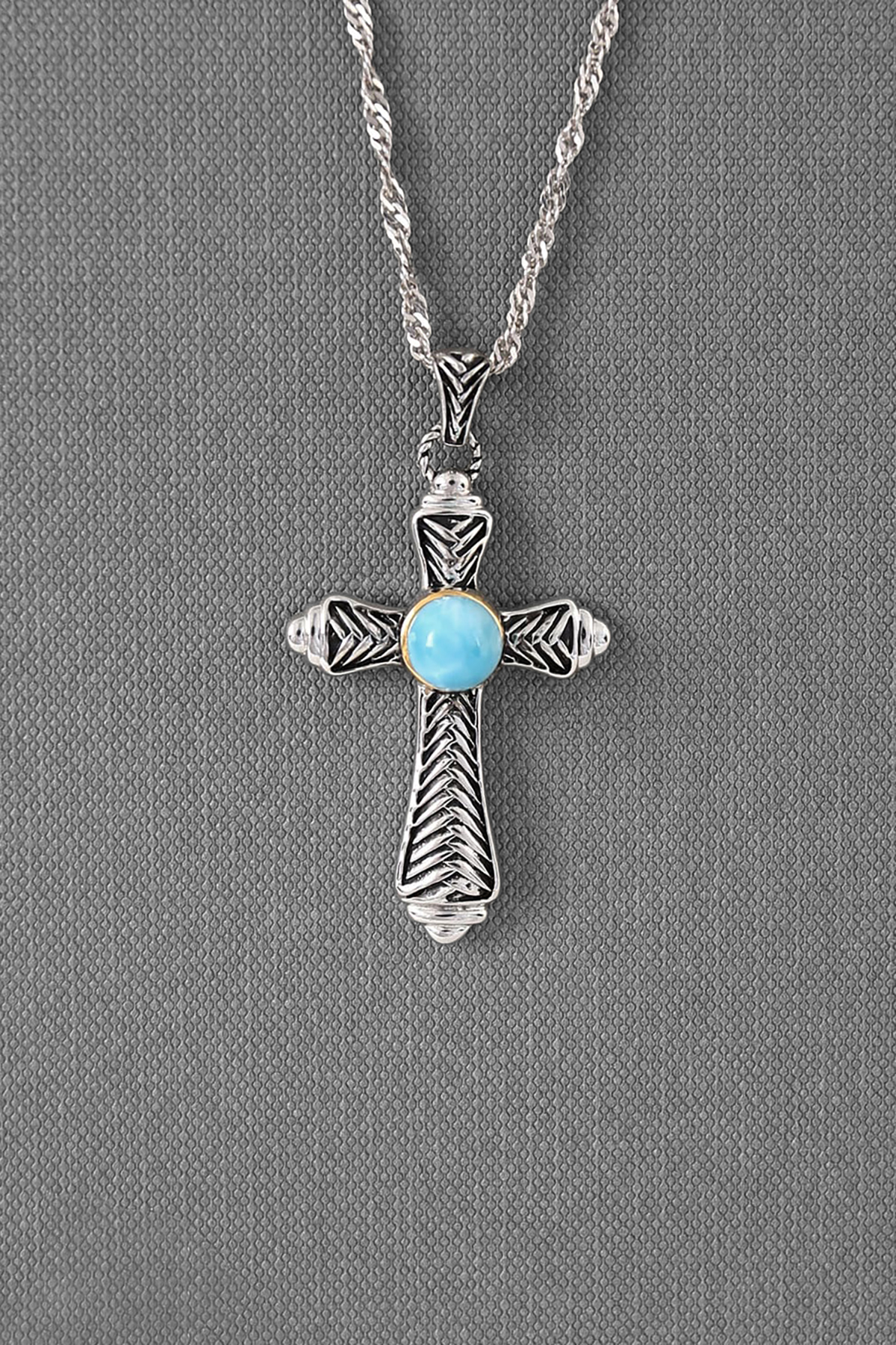 Antique cross pendant in sterling silver with genuine larimar bead 8mm. Item size 28x50mm.