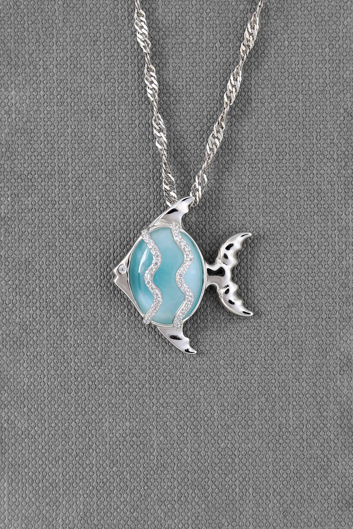 Silver tropical fish pendant, with genuine Larimar cabouchone 12x16mm oval on fish body and white zirconia paved stripes. Item size 24x26mm.
