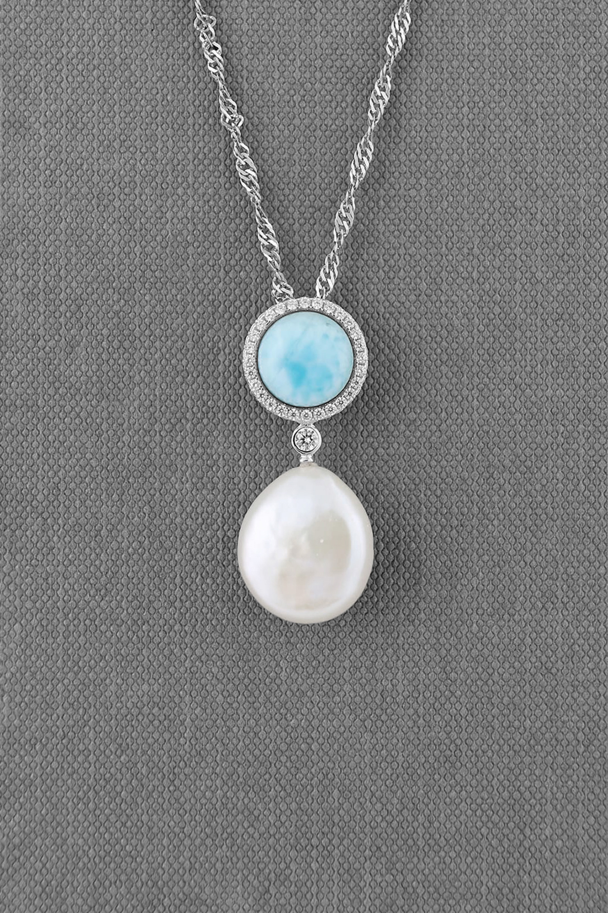 Rhodium plated larimar silver pendant in genuine 10mm round cab outframed by small white zirconia and a pear shape's natural pearl. Item size 13x30 mm.
