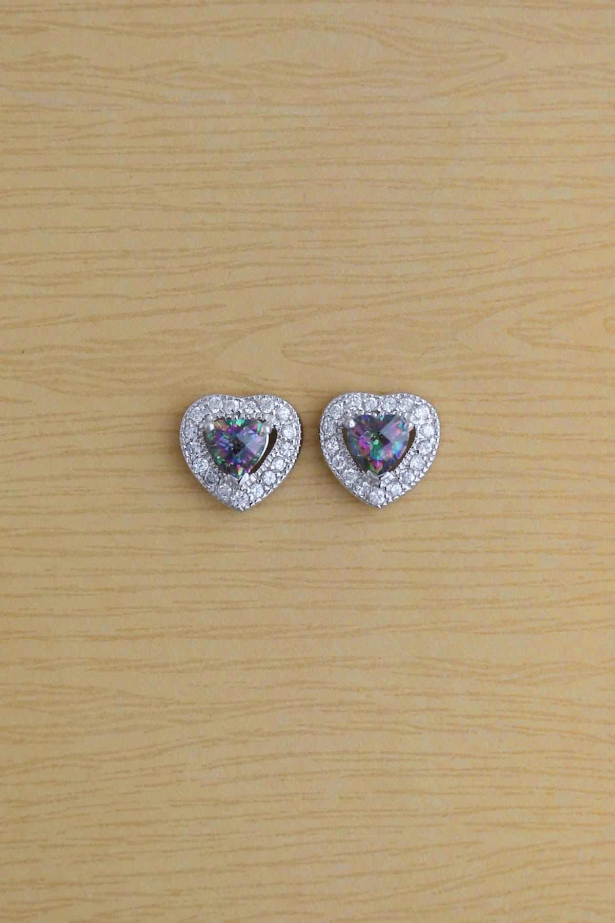 Vintage Rainbow Topaz pierced stud earring in 925 silver, bezelled by main stone sized 6x6mm heart and outframed with clear zircons to add its glamour. It's classic but never-out-of-fashion style for your daily wearing. Item size : 12x12 mm. Matched pendant RT-7808