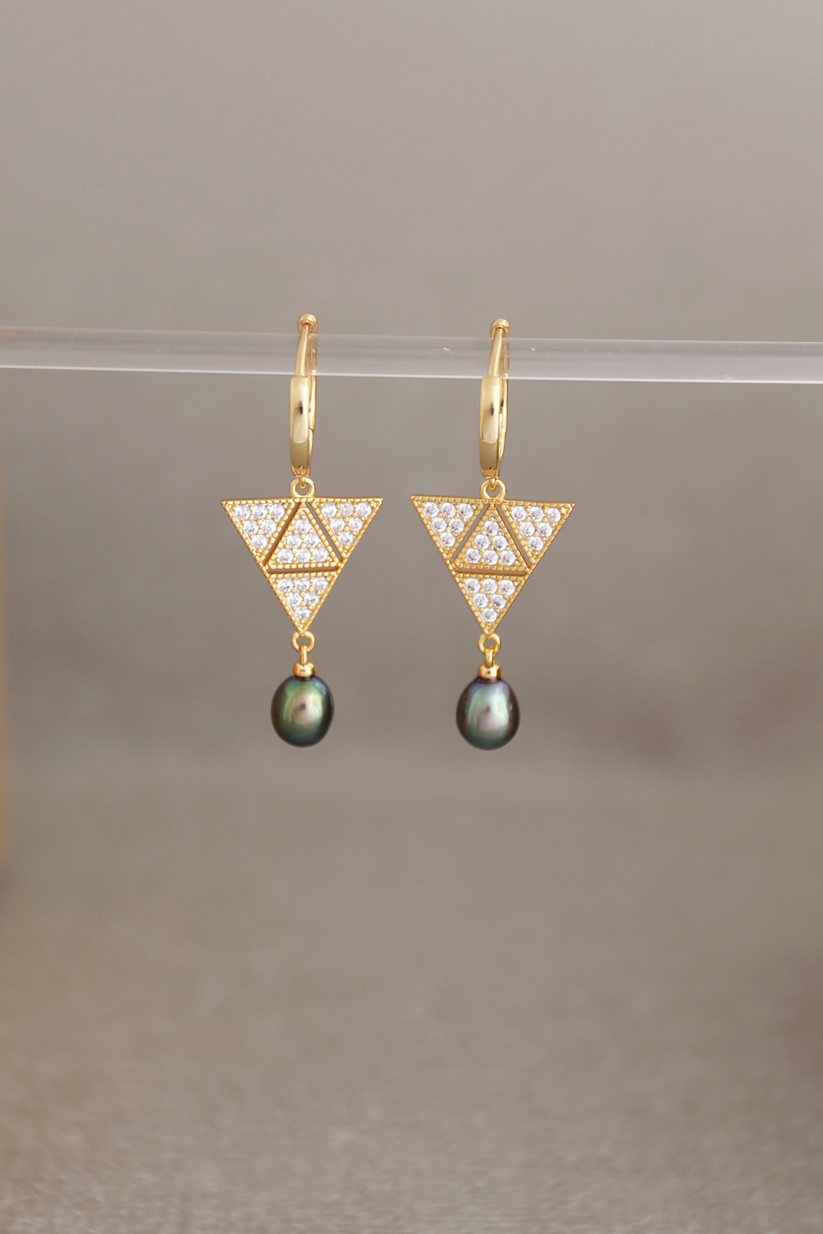 Description : CZ and black fresh water pearl double-drop hanging from a simple huggie hoop