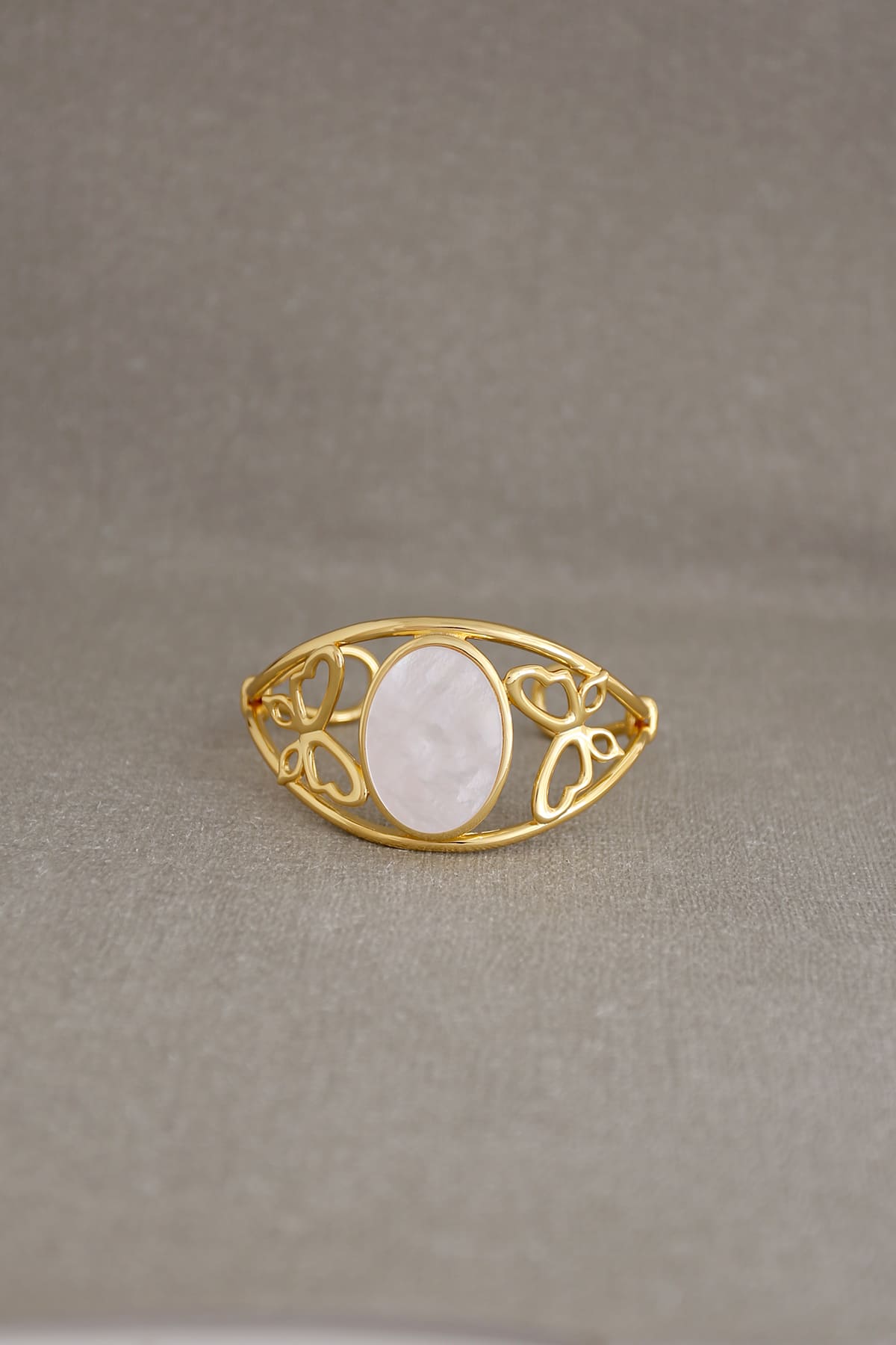 Description : Filigree metal bangle cuff, with a large natural white mother of pearl centrepiece,