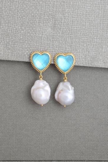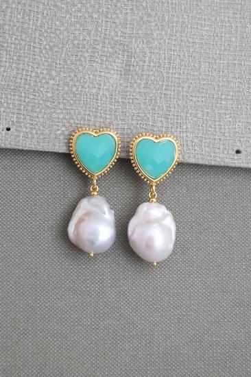 Description : Exquisite earrings of genuine baroque pearls, linking to a faceted lime color gemstone