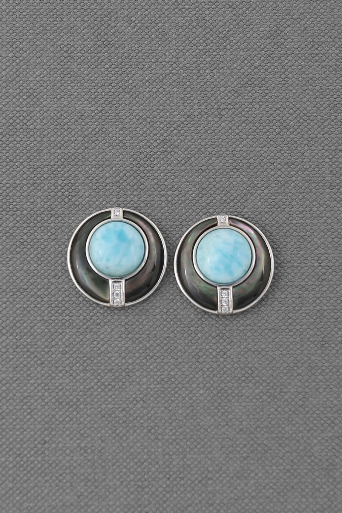 Larimar classical but elegant earrings post, made from sterling silver, with genuine larimar round cabs 10mmx2 surrounded by hand-made inlaid black mother of pearl. Item size 19x19mm.