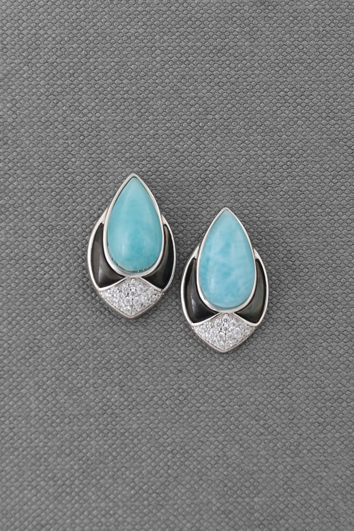 Larimar silver earrings post, base set by clear zirconia and hand-crafted inlaid black mother of pearl, with genuine larimar teardrop cabs 8x15mmx2. Item size 14x22mm.