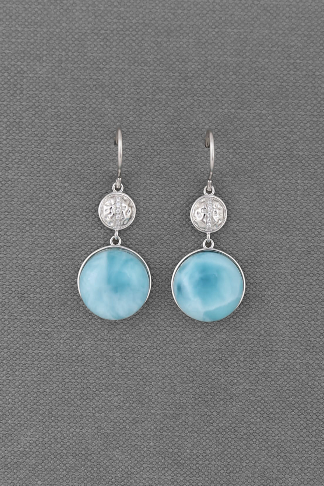 Larimar hooked earrings in sterling silver and rhodium finish, genuine main stone cabs 12mmx2 round with small zirconia. Item size 15x40 mm.