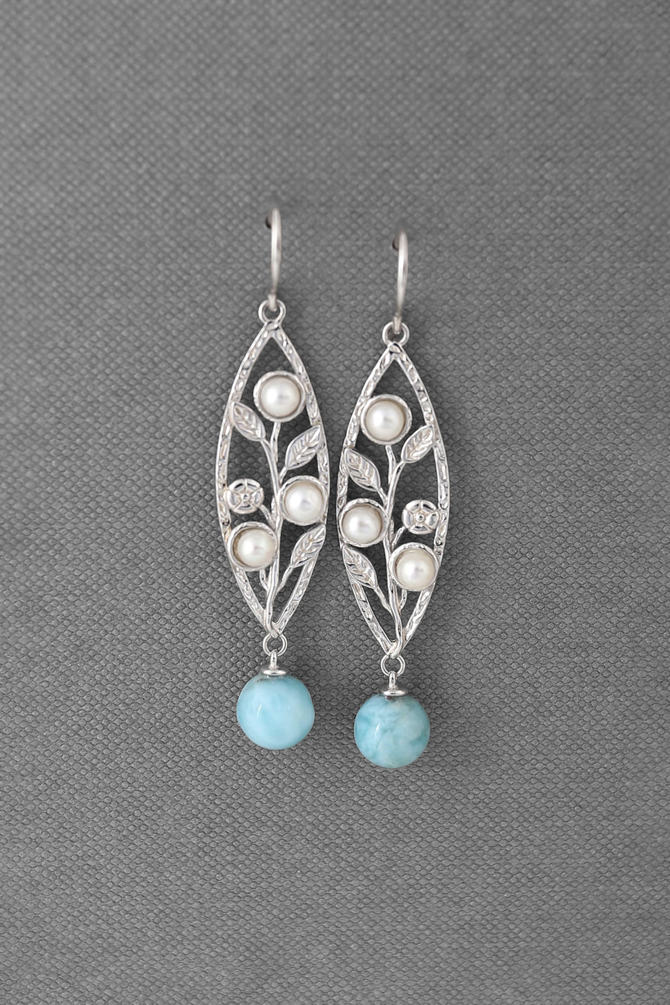 Filigree linear silver dangled earrings decorated natural white pearl 2.5mmx6 round, rhodium plated with genuine top quality Larimar beads drop 8mmx2. Item size 13x60 mm.
