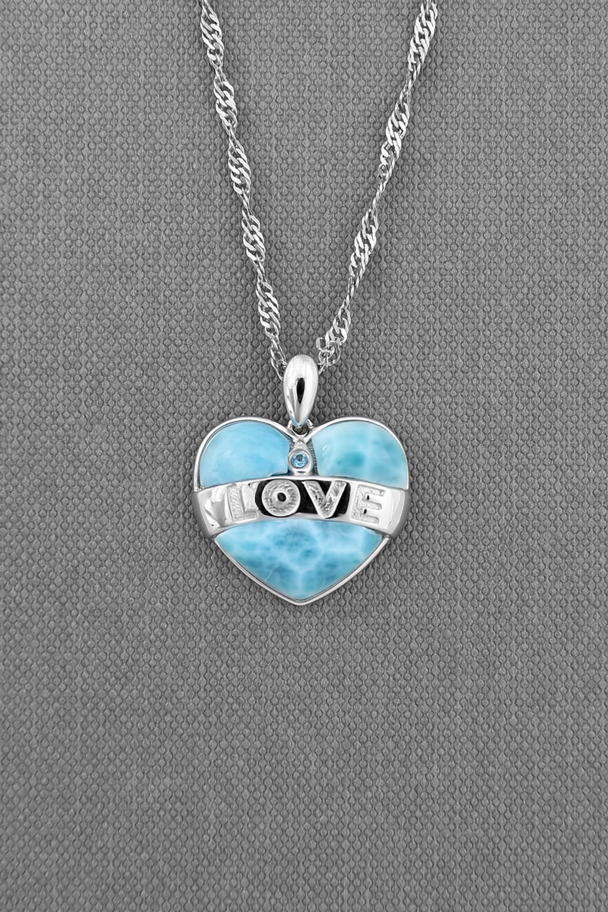 LARIMAR inlaid heart pendant in rhodium finish, genuine larimar stone inlaid and blue topaz 2mm round. Item size 25x22mm.