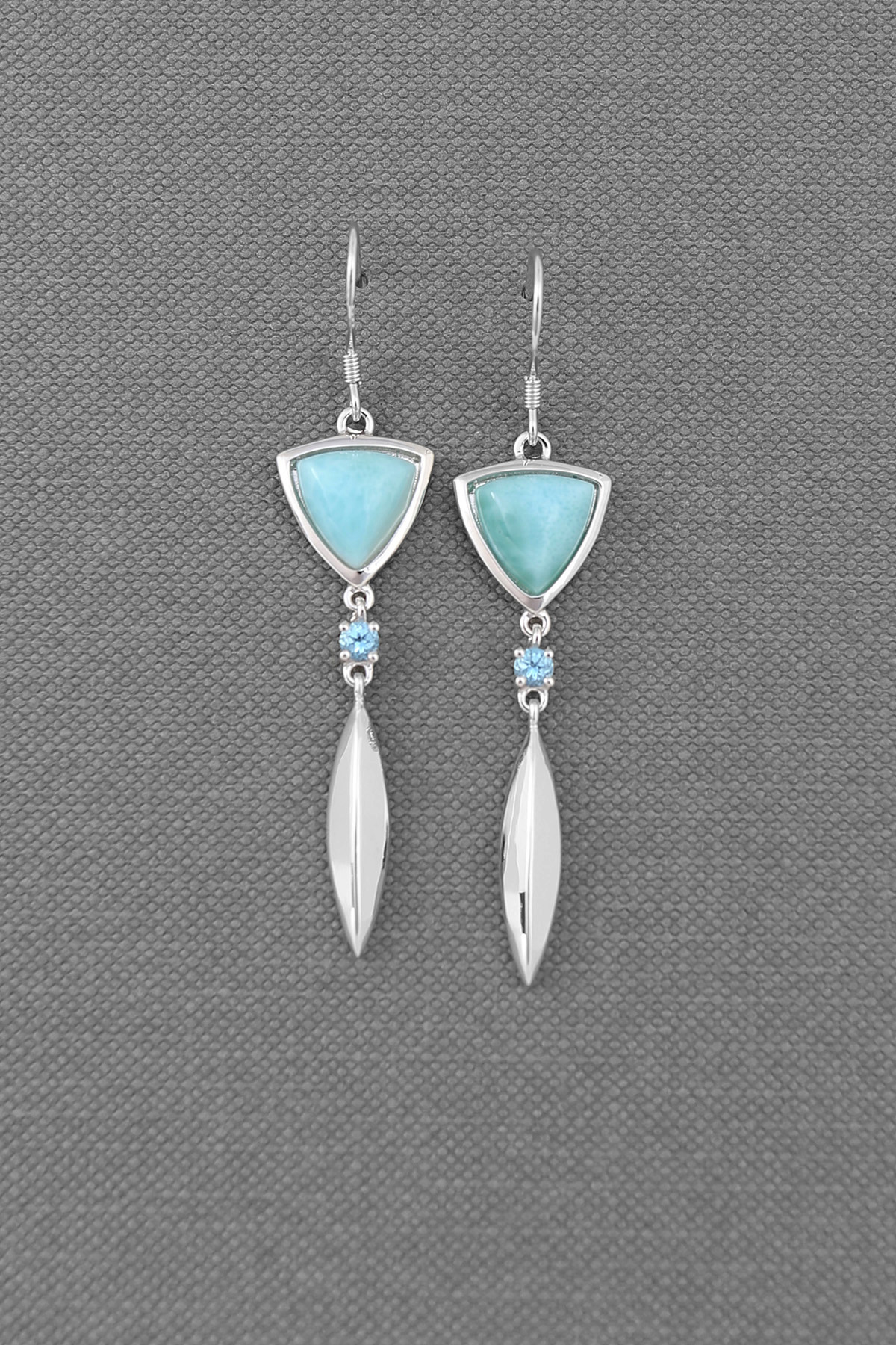LARIMAR Silver hooked earrings -- rhodium plated, genuine stone 10x10mm triangle and blue topaz 2.5mmx2. Item size 12x41mm. Matching pendant # 98-19 and ring # 320.