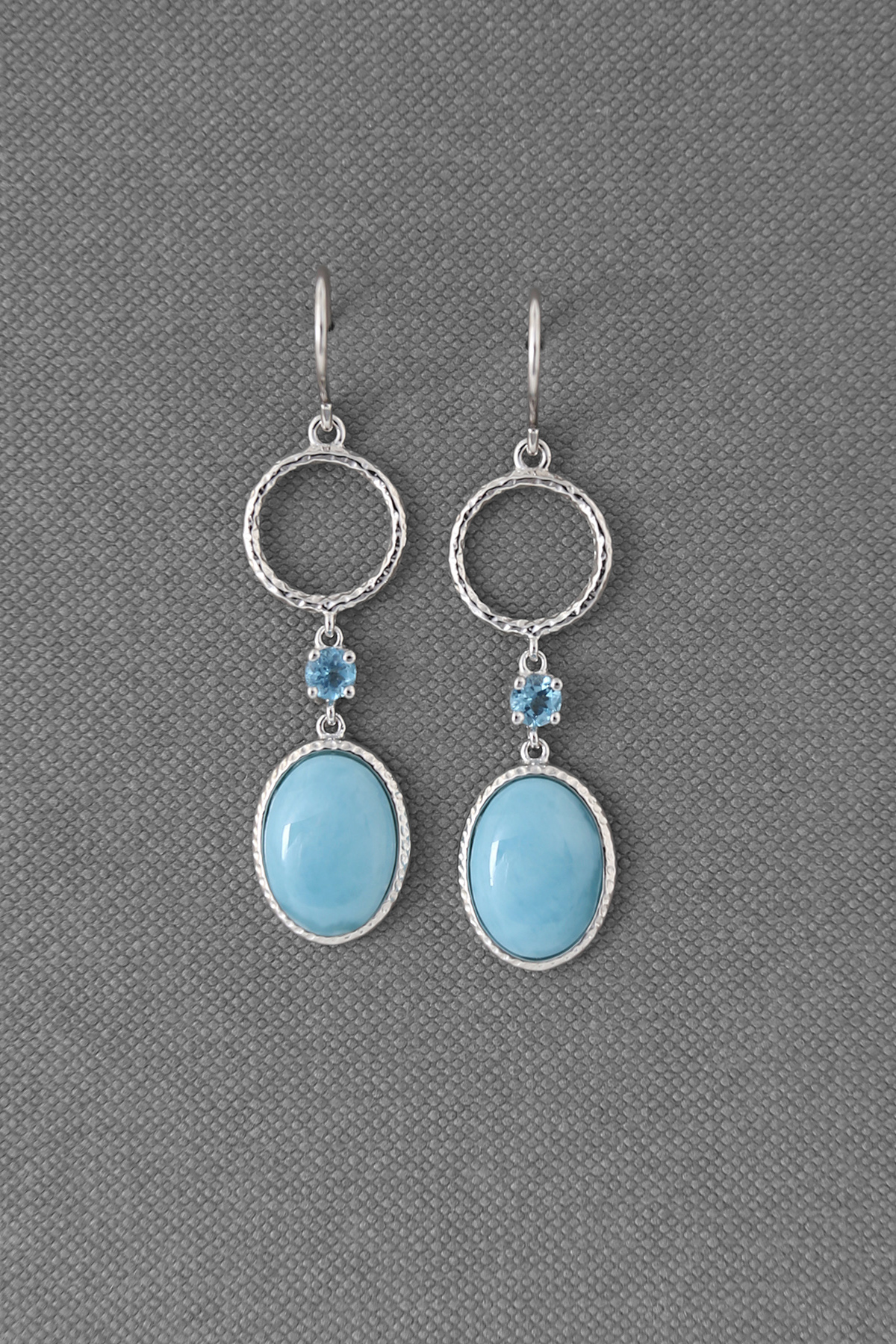 Sterling silver hooked earrings -- rhodium plated, genuine Larimar chabouchone 10x14mmx2 oval and blue topaz 4mmx2. Item size 26x39mm.
