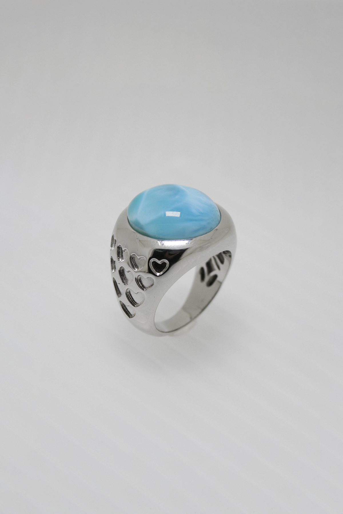 LARIMAR Silver ring, with genuine stone 15mm round and rhodium finish.