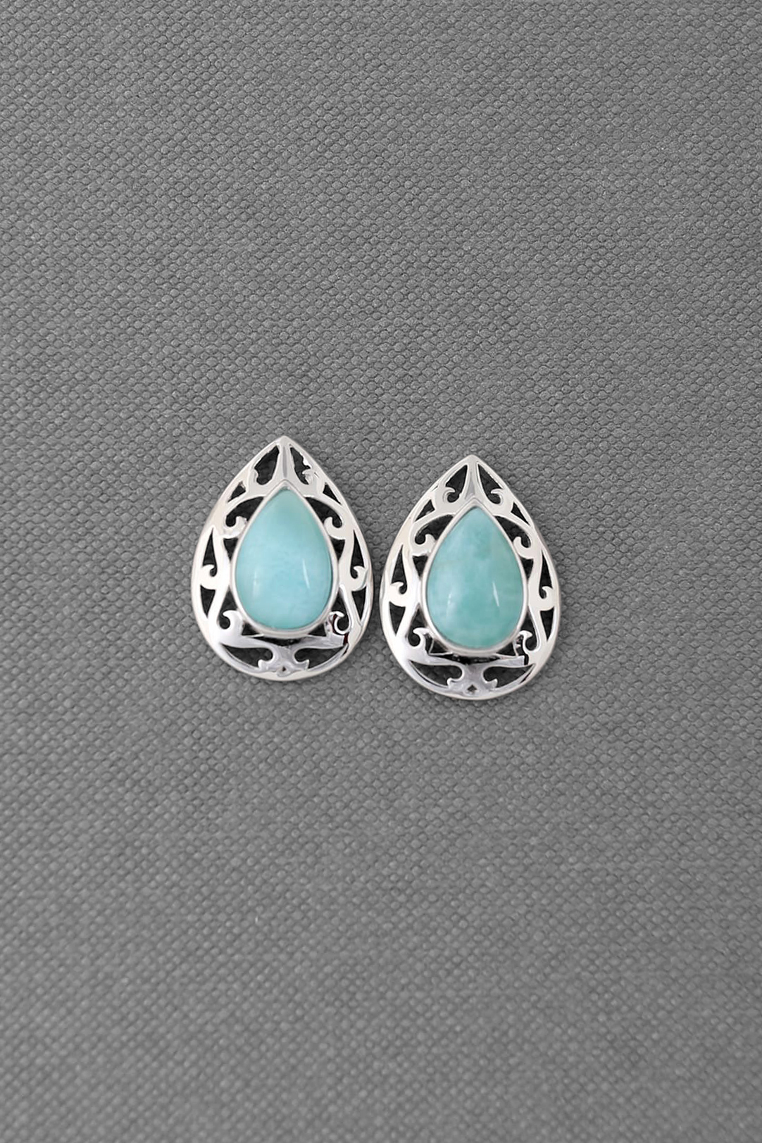 Larimar exquisite earrings in 925 sterling silver and rhodium finish, genuine larimar stone 8x12mmx2 pear. Item size 16x22mm. Matching pendant # 98-124.