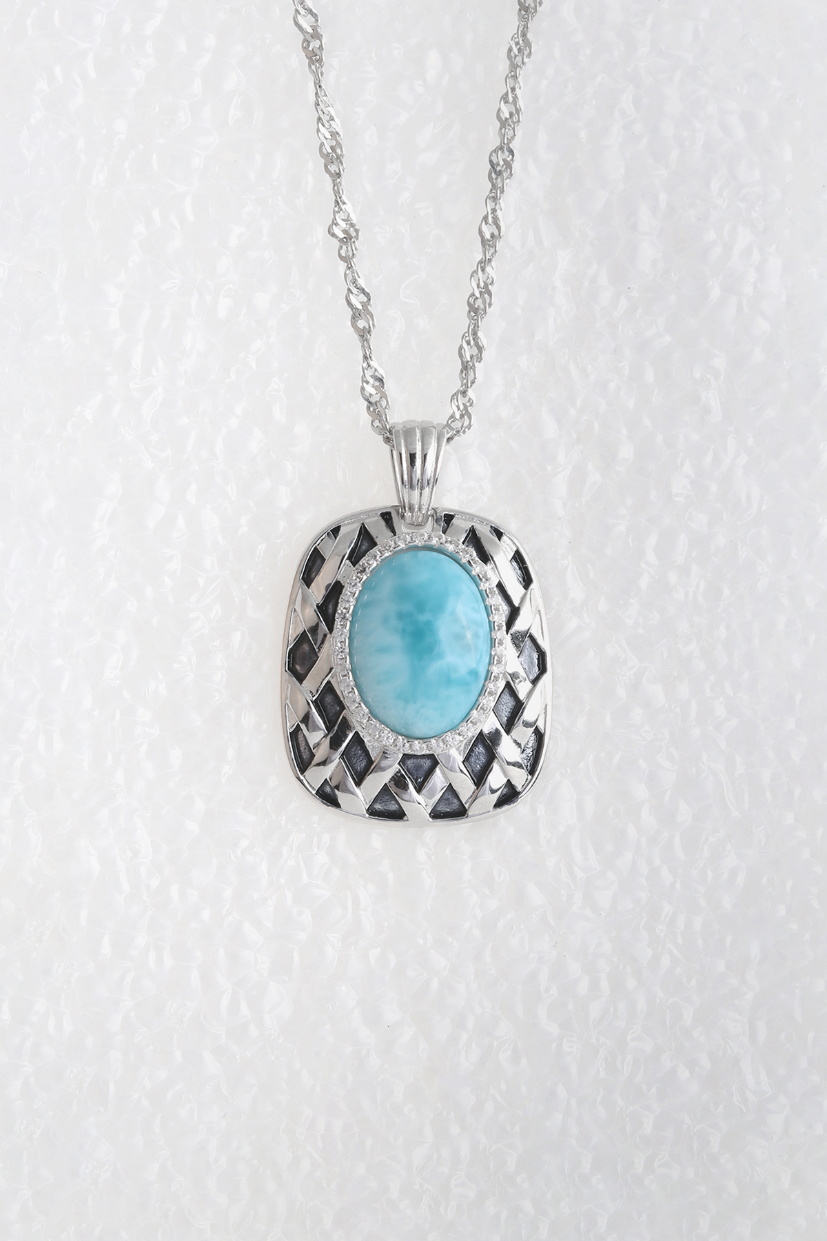 LARIMAR silver pendant -- rhodium plated and blacken treated, genuine larimar 10x14mm oval framed by 32 small white zirconia. Item size 23x33 mm.