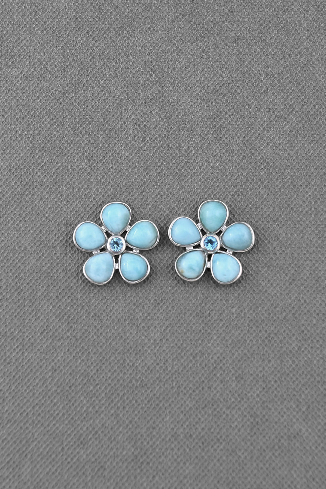Sterling silver 'flower' earrings, sized 17x17mm and rhodium plated, genuine Larimar 5x6mmx10 small pear and blue topaz 3mm round, matching pendant # 98-09.