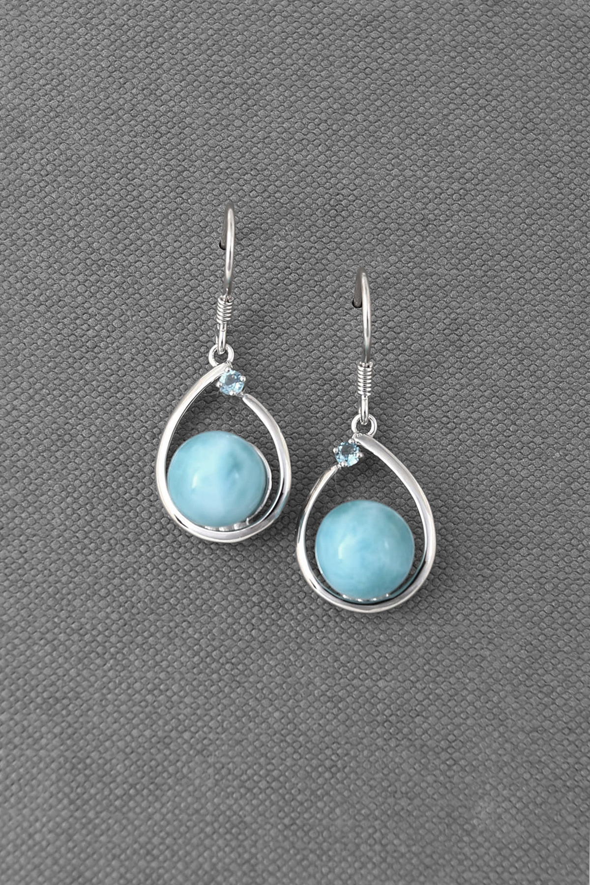 Larimar Bead Earrings, in 925 sterling silver and rhodium finish, genuine stone larimar 9-9.5mm dia. round and 2.5mm round blue topaz.