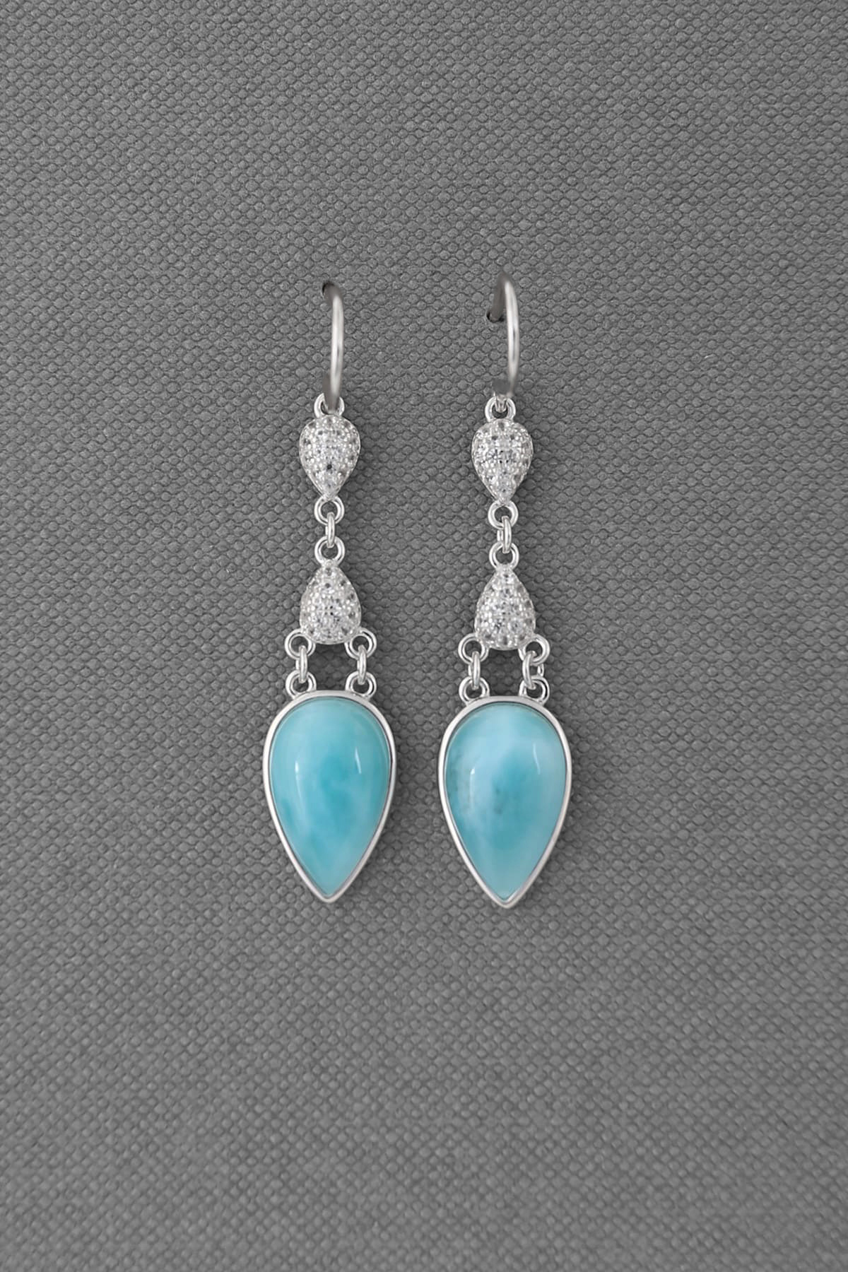 Long shaped dangled earrings, sterling silver pair in genuine larimar 9x15mmx2 and radiant white zirconia. Item size 12x44mmx2, matching pendant # 98-87.