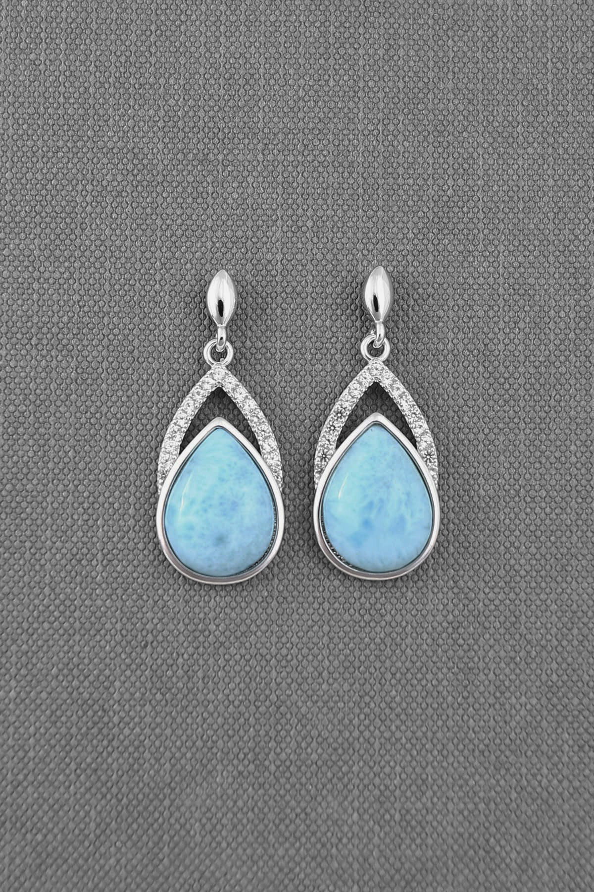925 silver Earrings, rhodium plated, genuine larimar 12x16mmx2 pear and clear small zirconia. Item size 14x35 mm. Matching pendant # 98-83.
