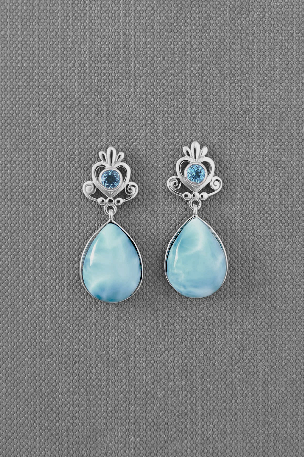 925 sterling silver Earrings, rhodium plated, genuine Larimar 12x16mmx2 pear, blue topaz 4mmx2. Item size 26x19mm.