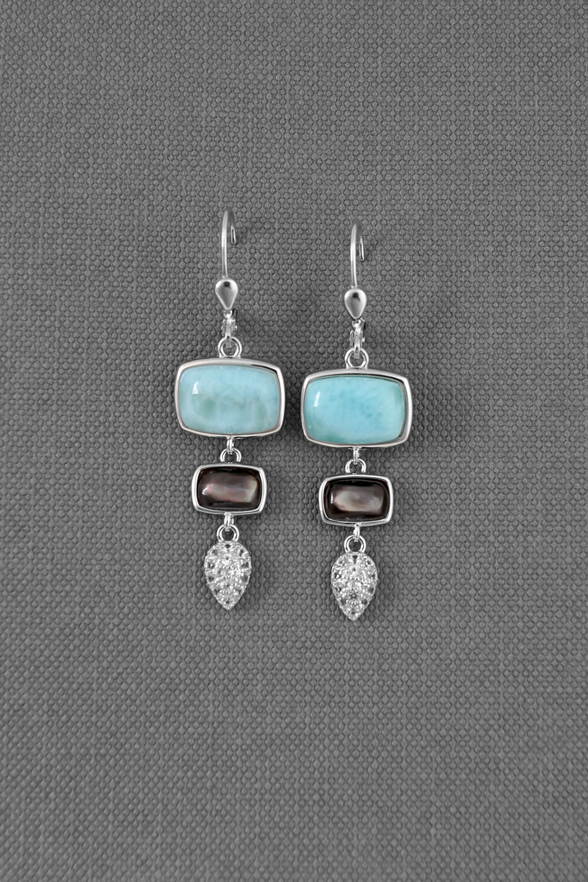 Long shaped silver earrings, the mixture of genuine inlaid Larimar, black mother of pearl and white zirconia. Item size 11x32mm, matching pendant # 98-92 $ 30.50.
