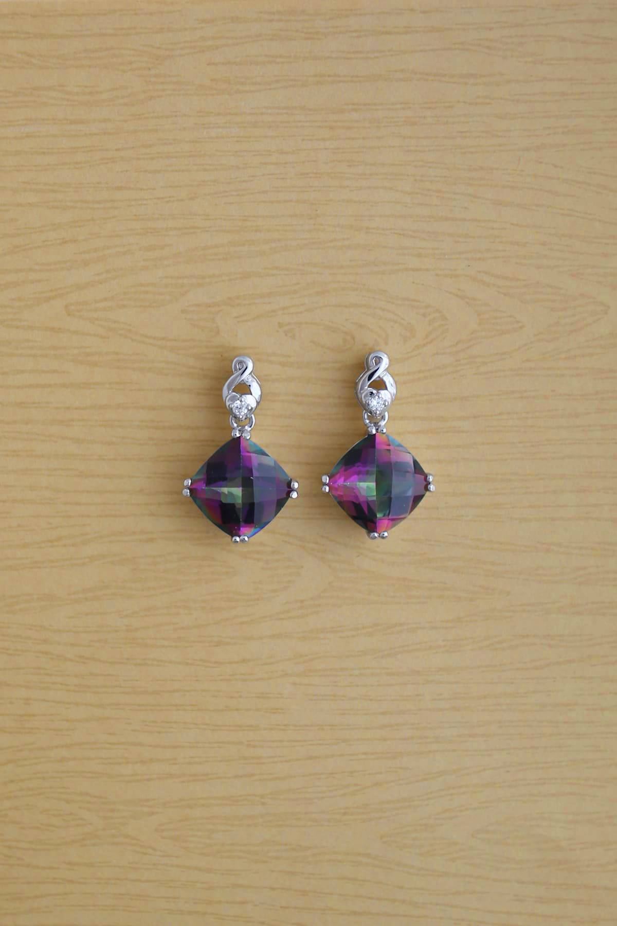 Gorgeous rainbow lights mystic topaz Dangled Earring in 925 sterling silver, decorated by clear cubic zirconias, with main stone sized 10x10 mm cushion. This multi-color topaz pair is the best gift for women wearing at any occasions. The matched pendant RT-7802. Item size : 22x13 mm.