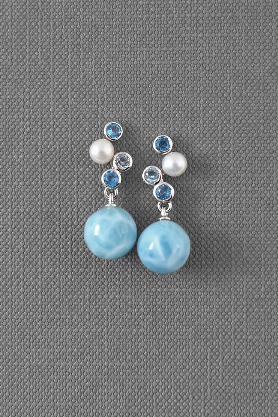 925 sterling silver dangle Earrings, rhodium plated, genuine larimar bead 9.5-10 mm diameter, blue topaz 3mmx6 and pearl 3.5mmx2 round.
