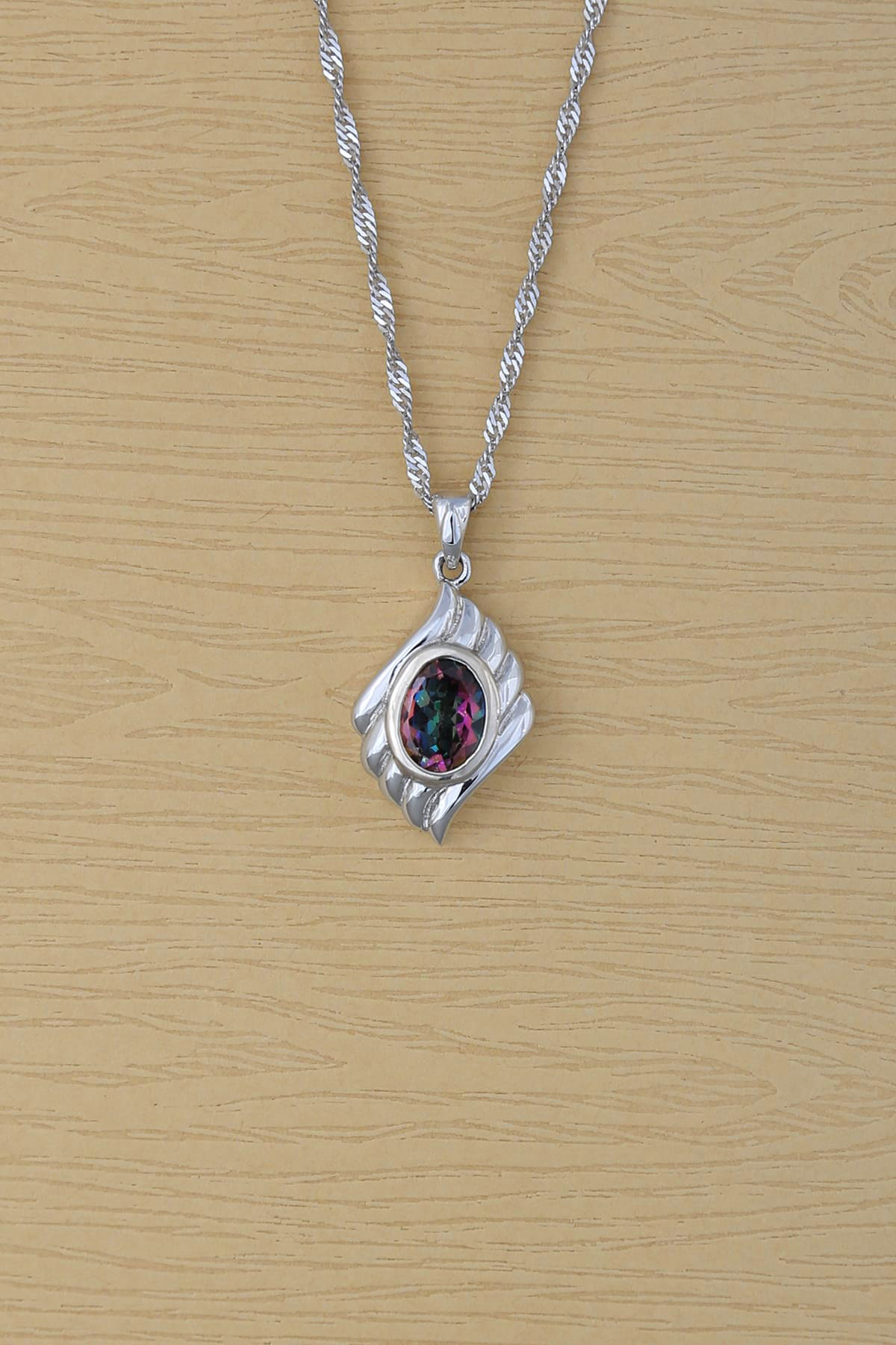 Two tone plated sterling silver pendant bezelled with rich color rainbow lights topaz stones sized 7x9 mm oval. It's completely handmade and looks elegant for wearing in any occasions. Item size : 14x25 mm.