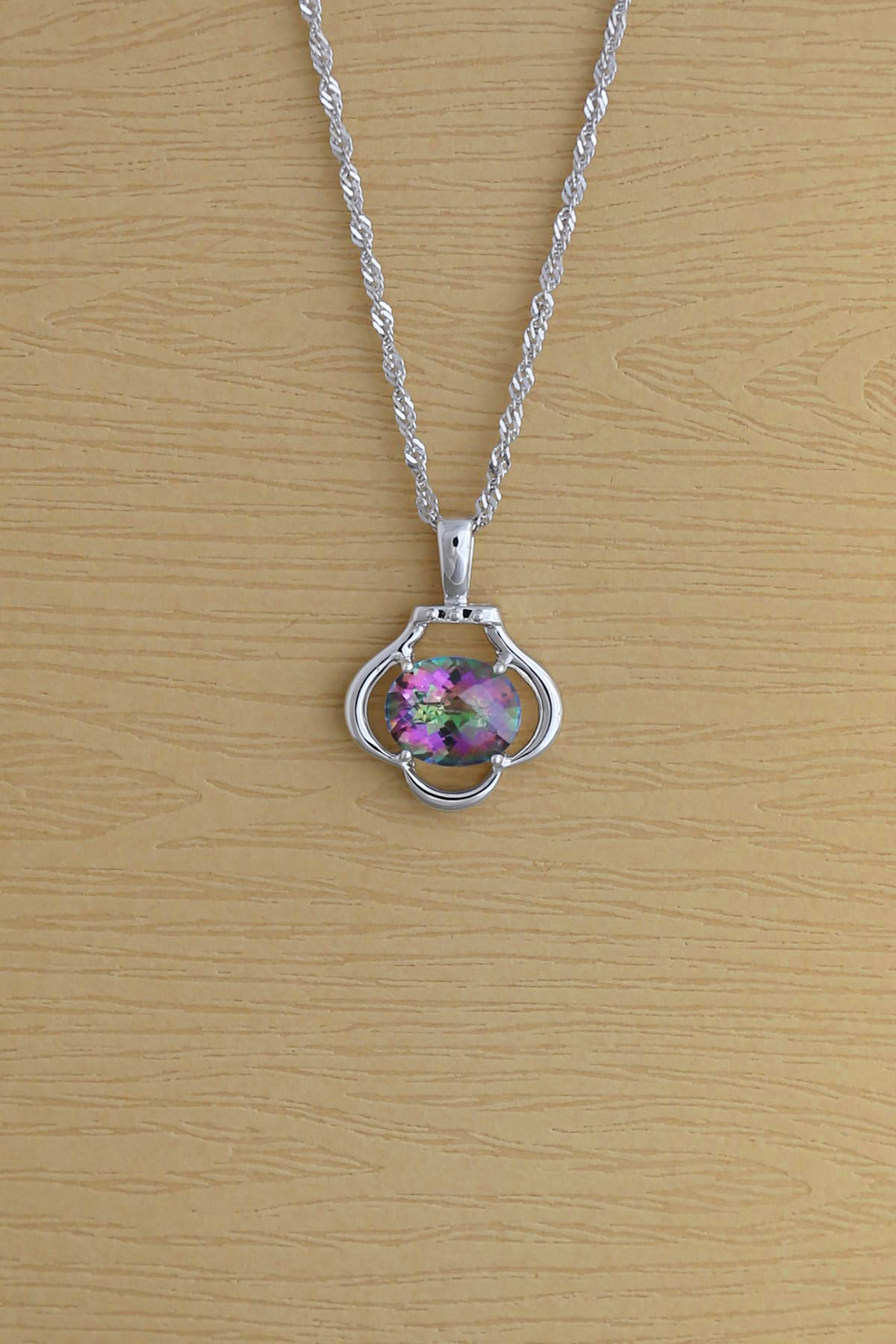 Simple but cool rainbow lights mystic topaz sterling silver pendant, 4-clawed polished setting, It's a slip-on jewelry piece for daily wearing and great fit for dress-up or casual outfits. Stone size : 8x10 mm oval. Item size : 16x22 mm.