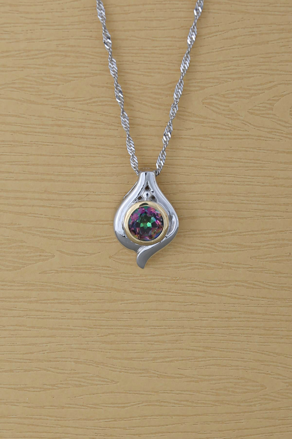 A mystiric topaz silver pendant shows the glamour of main stone a rainbow hues of green through purple bezeled on a lovely set with two-toned finish. It's affordable, never-out-of-fashion and can be great gift for the ones you love. Stone size 8x8 mm round. Item size 14x22 mm.