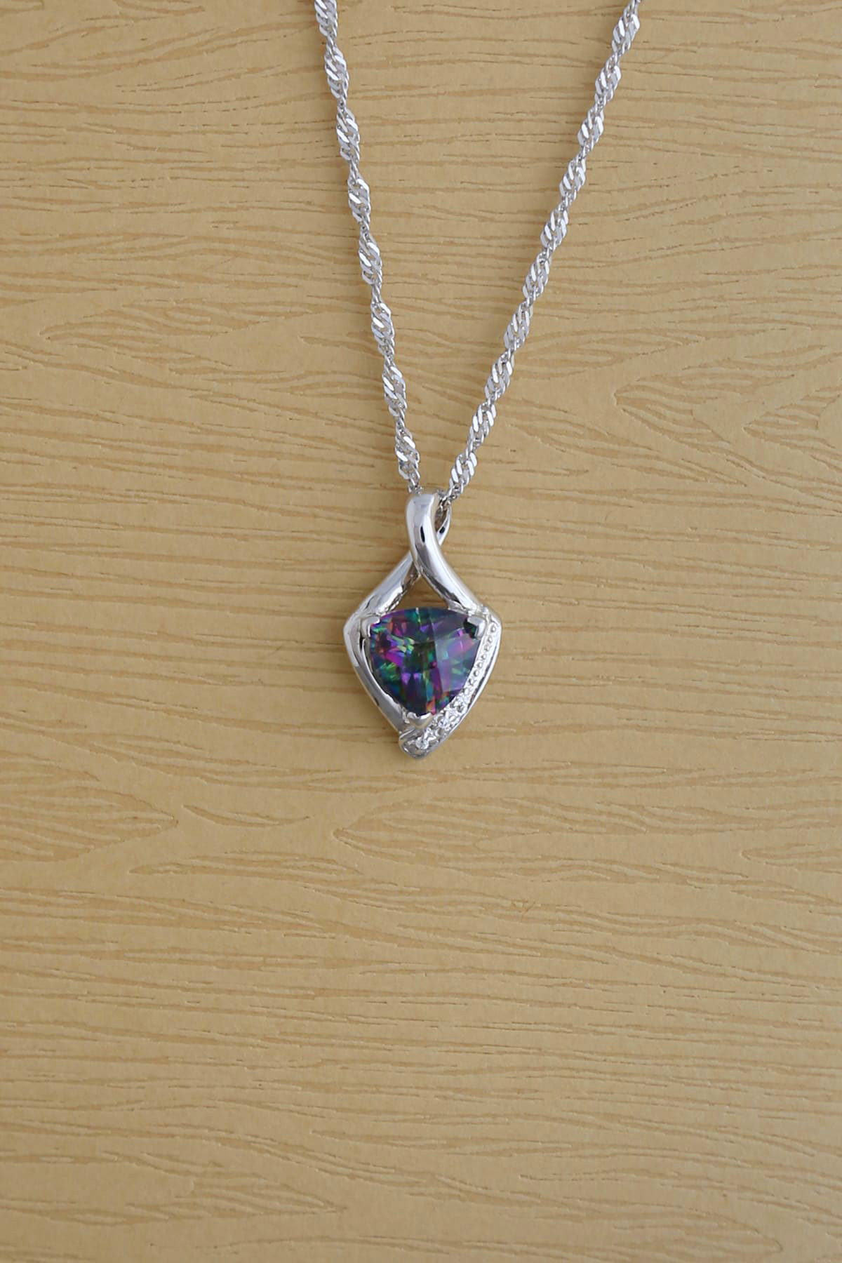 Lovely rainbow topaz pendant, rhodium over sterling 925 silver, with rich stone color and excellent sparkle main stone sized 8x8 mm trillion. Adding small clear zircons it looks simple and cool for casual or dressy wear. Item size : 12x20 mm.