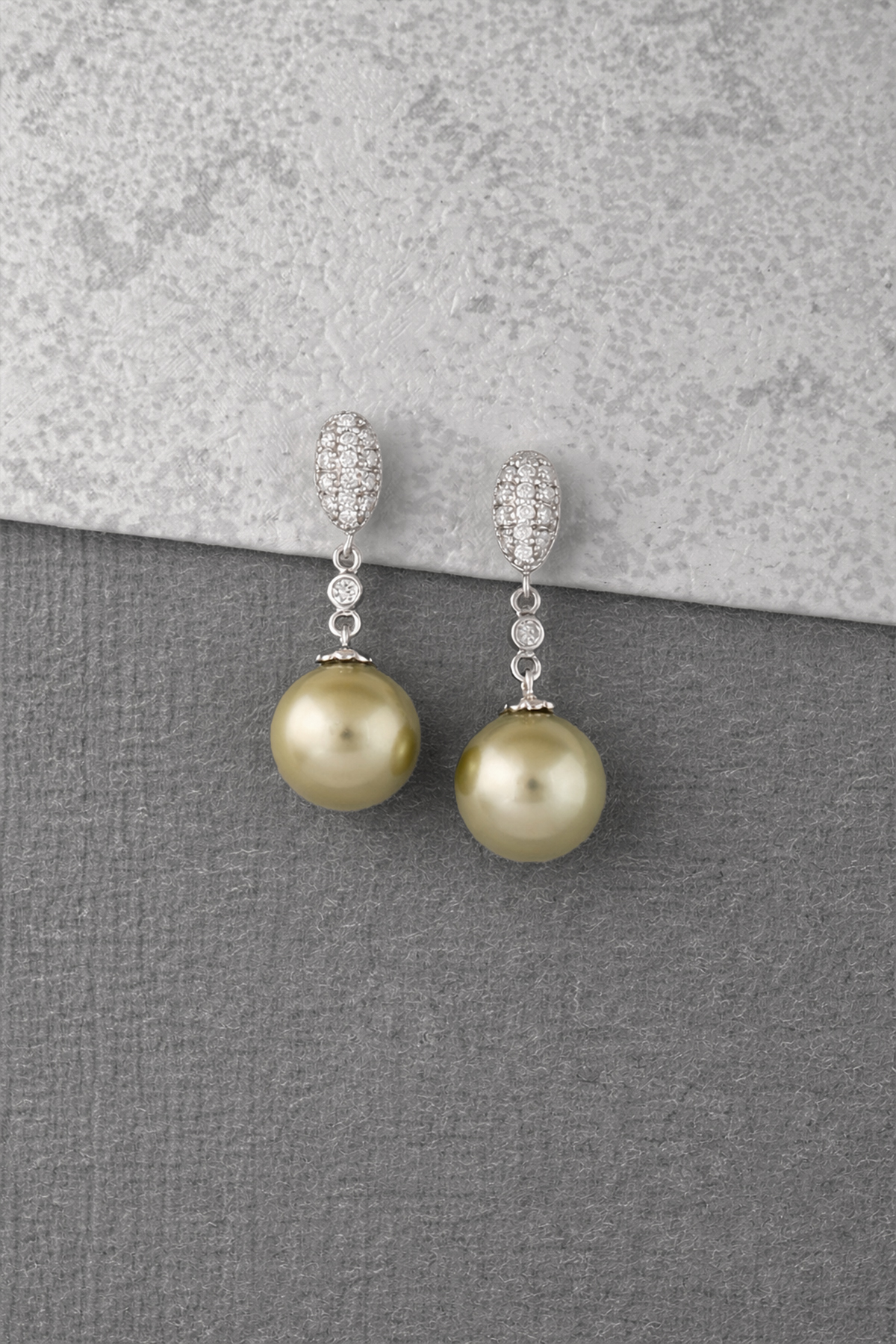 Silver cz-studded silver dangle earring with AAA quality South Sea shell pearl bead 12 mm diameter offering statement pair at a price point will bring you an easy elegance to fit any of your outfits.