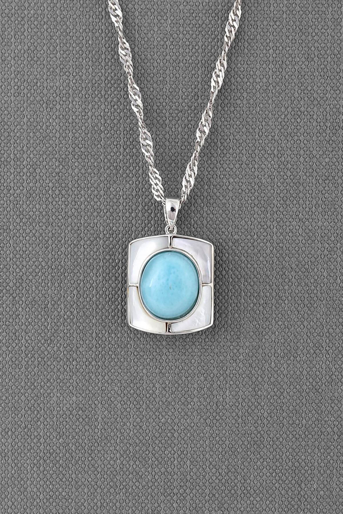 This is a delicated larimar cushion-shaped silver pendant with hand crafted inlaid white mother of pearl and genuine high quality center larimar cab. It is graceful and beautiful piece of jewelry for you in dress up or casual outfits. Stone size 10x12 mm oval.