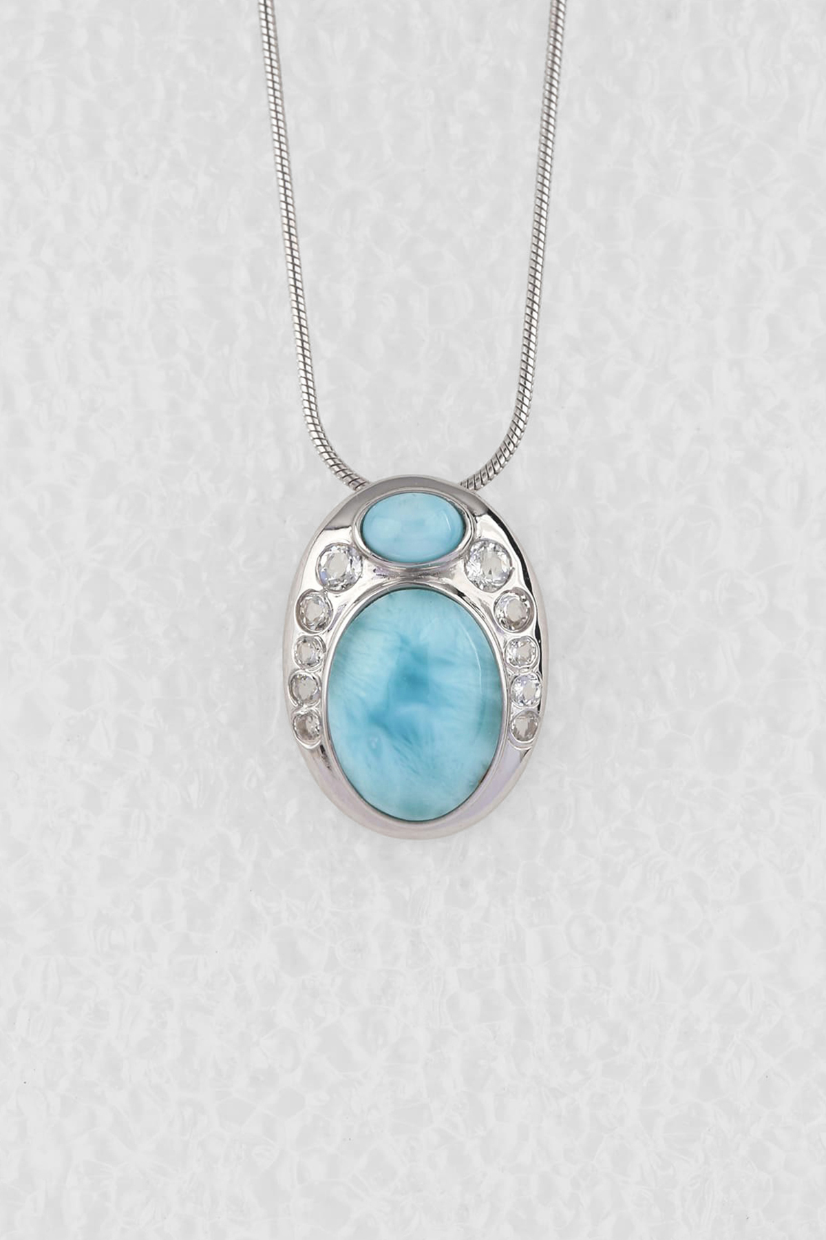 Larimar pendant in 925 sterling silver -- vintage style embedded with larimar cabs of 10x14 mm and 5x7 mm oval and clear cubic zirconia create this jewelry pair