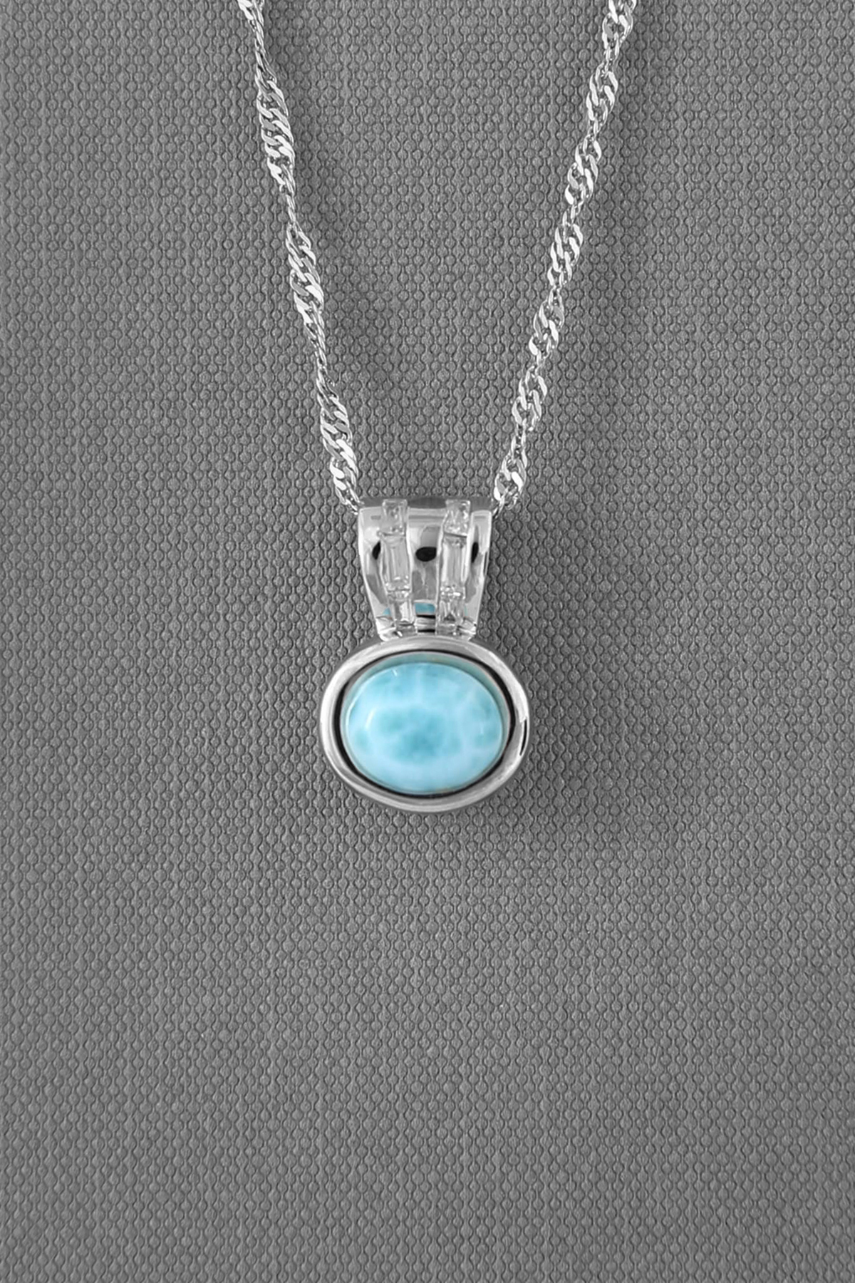Cute and shiny silver pendant decorated with high quality cz and larimar cab 8x10mm oval. Item size 18x13mm.