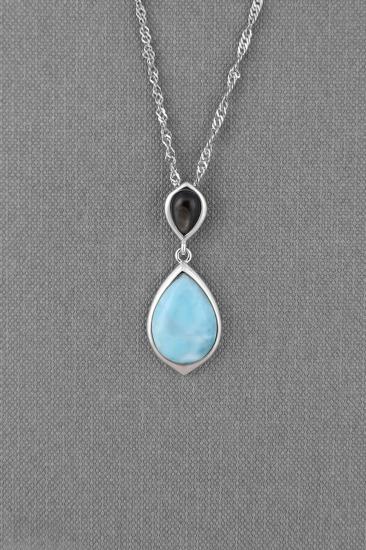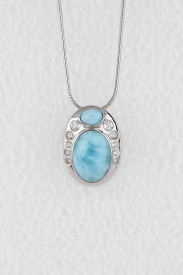A flying "Bee" Pendant, 18K white gold finish, genuine Larimar stones 6mm round and 7x9mm oval. Item size 33x22mm.