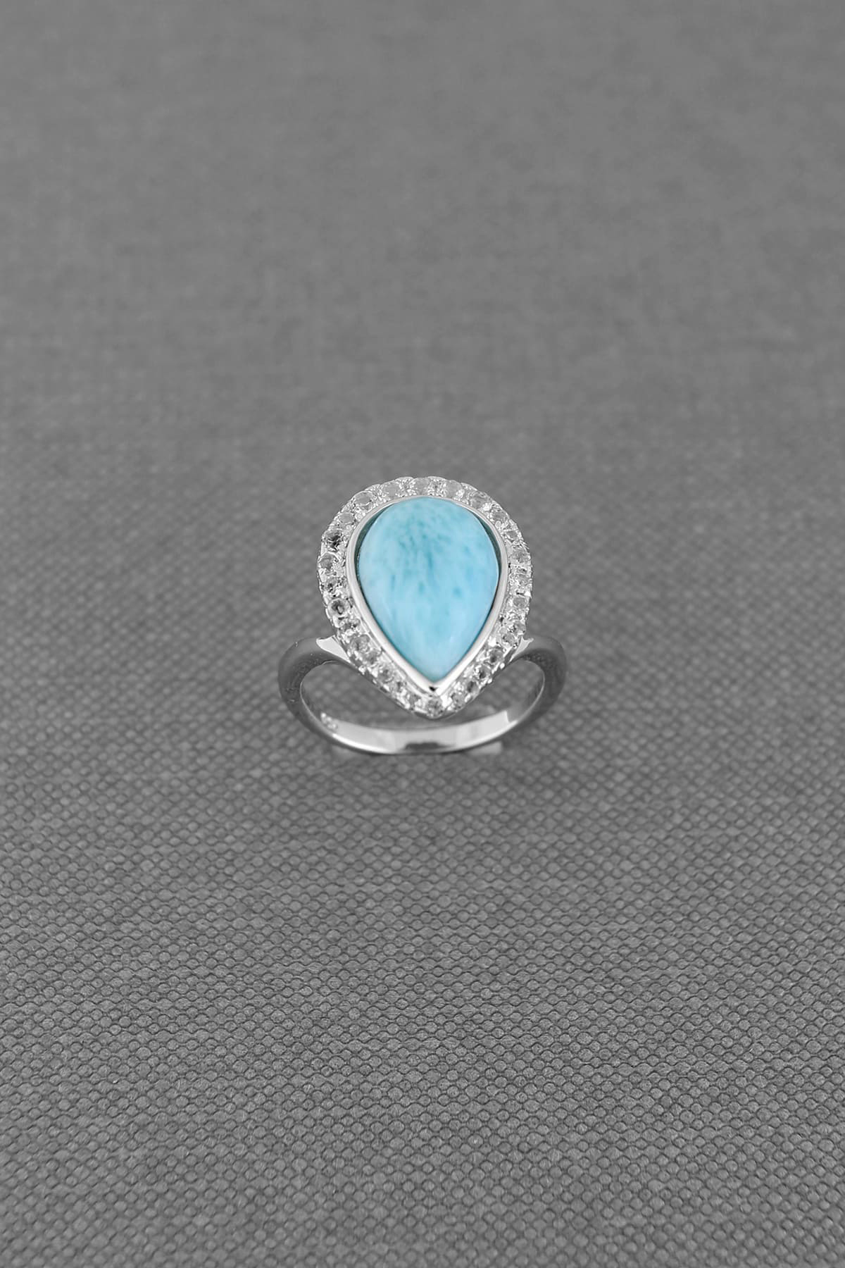 Larimar Silver Ring-- framed by small white zirconias with main stone larimar 9x13mm pear.