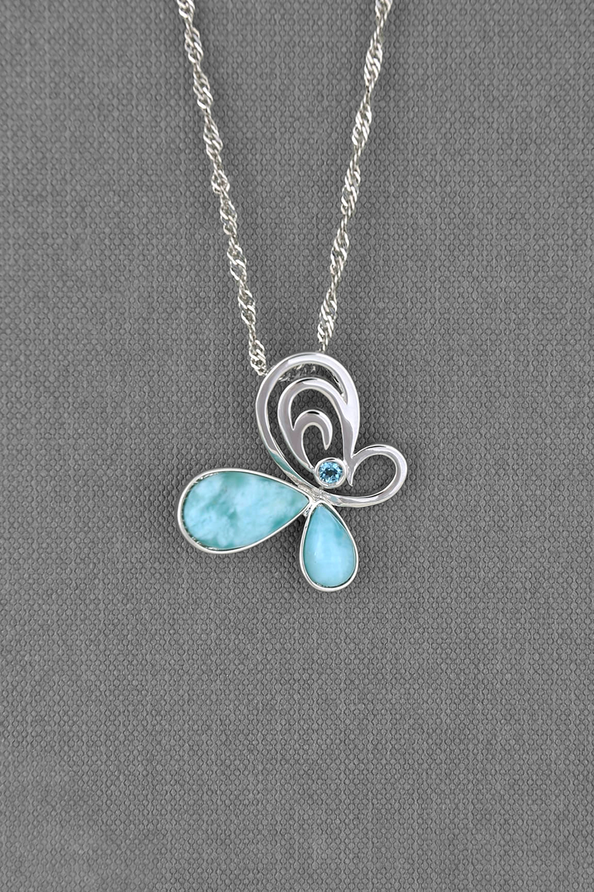 LARIMAR butterfly pendant -- rhodium plated, stone 9x15mm and 6x10mm teardrops, genuine blue topaz 4mm round. Item size 22x57 mm.