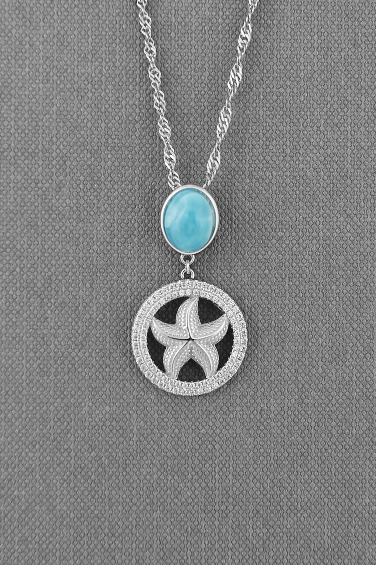 A 'sea life' spirit with the combination of genuine larimar stone, this Silver Pendant shows the energy from the nature. Main larimar stone 8x10mm oval and white zirconia. Item size 20x35mm. Matching earrings # 99-120.