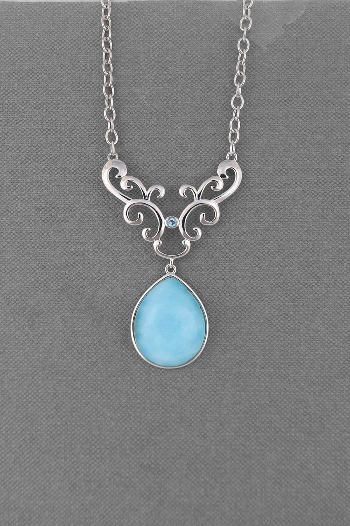 Larimar Necklace, in 925 sterling silver and rhodium finish, length 18 inches, genuine stone larimar 19x22mm big pear and 2.5mm round blue topaz.