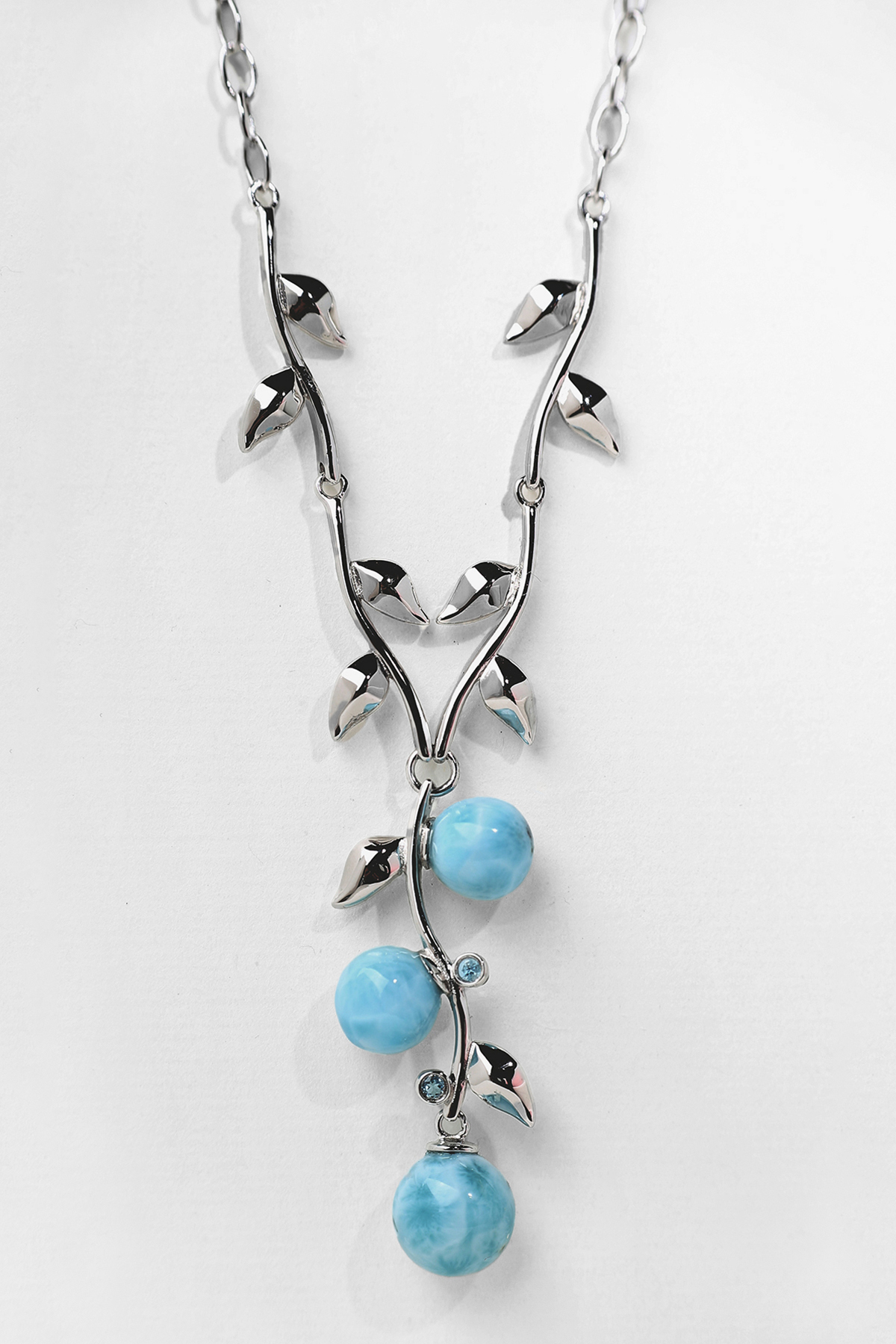 Larimar 'Y' shape Necklace, made from 925 sterling silver and rhodium finish, genuine larimar beads 8, 9, 10mm half-drilled beads and 2.5mmx2 blue topazs, length 18" with lobster clasp.