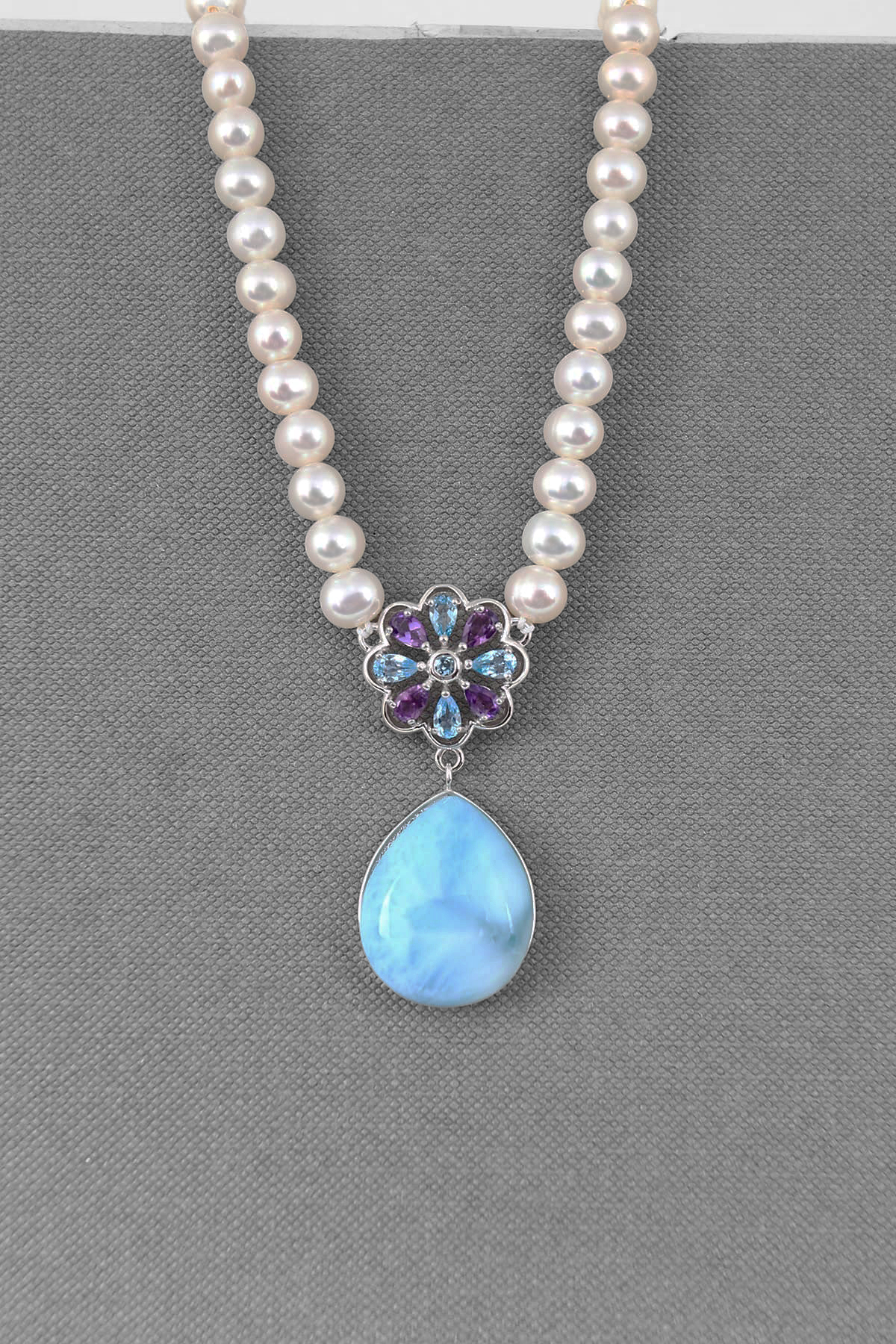 Genuine fresh water white pearl chain 7-7.5mm, with a 925 sterling silver dropped pendant encrusted by natural blue topaz, amethyst 4x6mmx4 teardrop each, and larimar main 18x22mm big pear. Pearl length 18" ended by a fish silver clasp.
