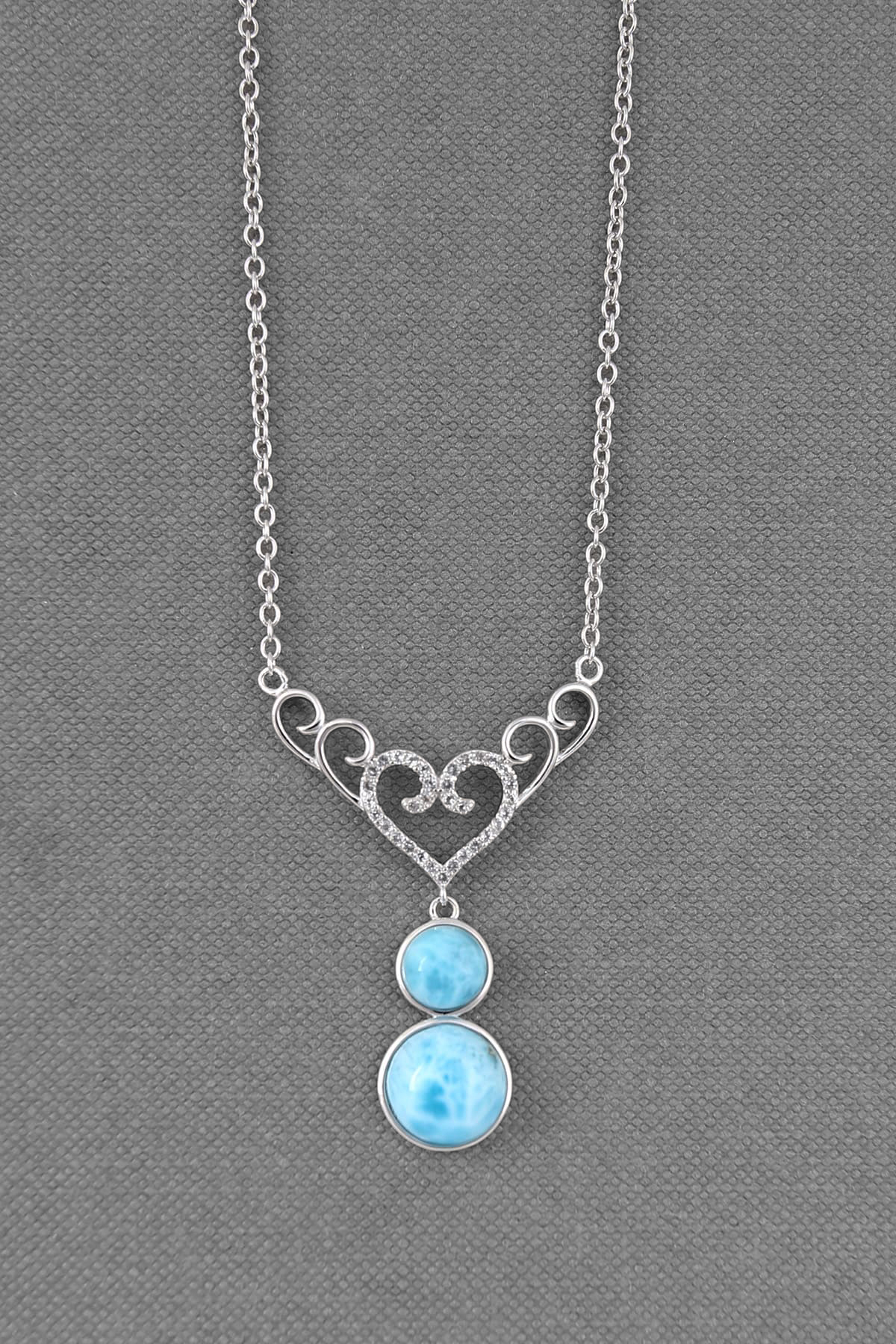 Larimar Silver Chain with filigree larimar dropped pendant, rhodium plated, genuine larimar 7 & 10mm round and top quality white zirconias. Length 18" with lobster crab closure.