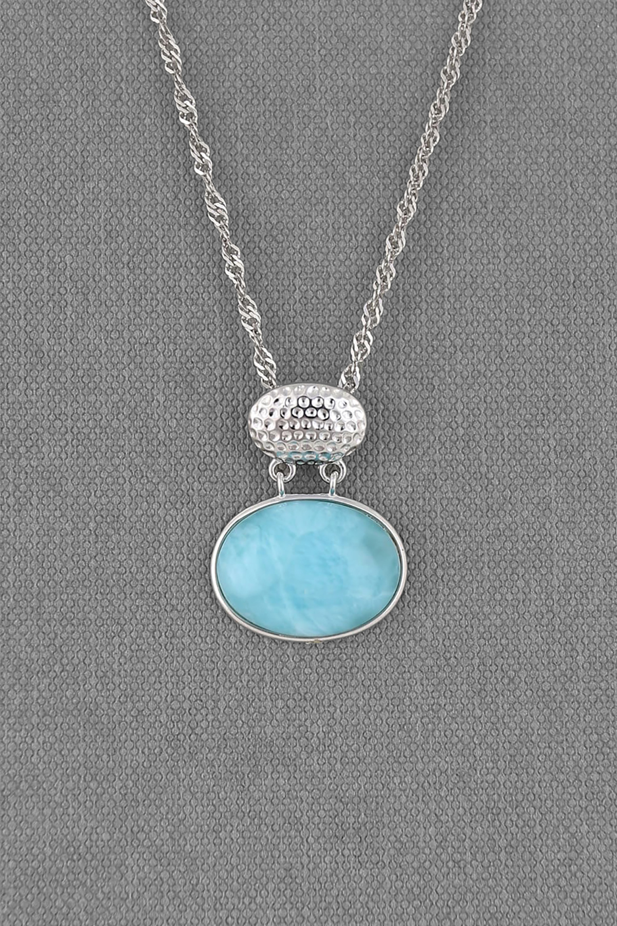 Silver larimar pendant, rhodium plating, decorative stamped piece with genuine larimar 13x18mm oval. Item size 22x20mm.