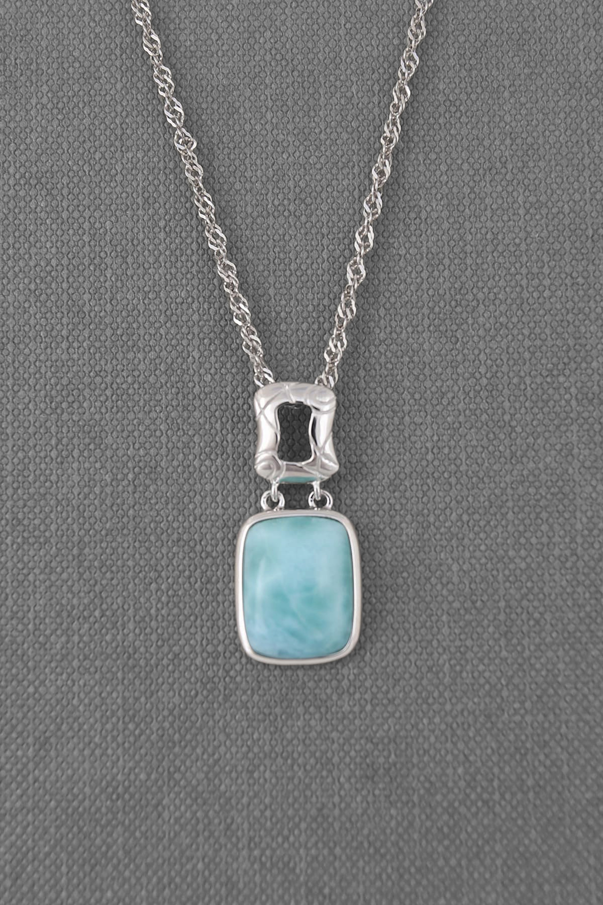Larimar silver pendant with rhodium finish, genuine stone 11x13mm long cushion. Item size 30x14mm.