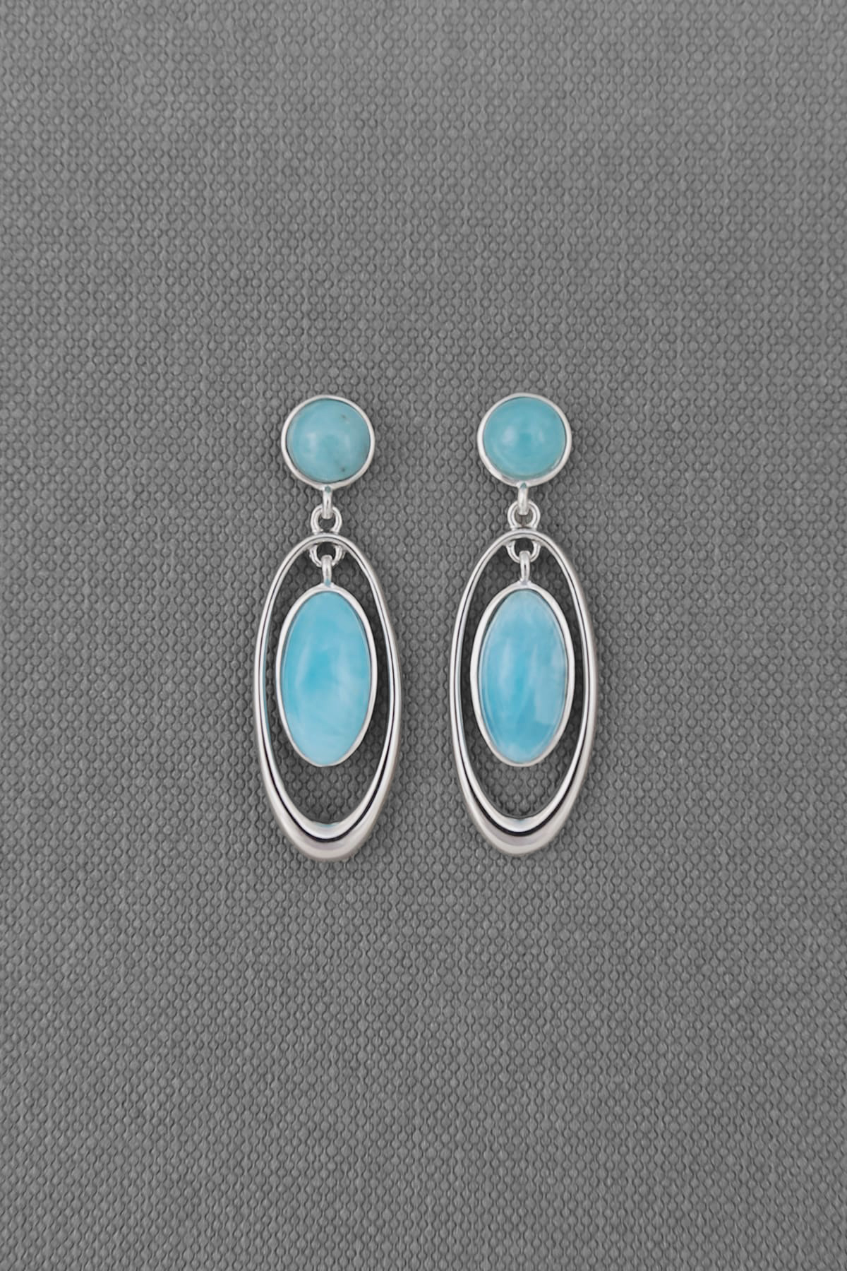 Dangled silver earring, rhodium plated, with genuine larimar cabs 7x13mmx2 long oval and 6mmx2 round. Item size 31x12mm.