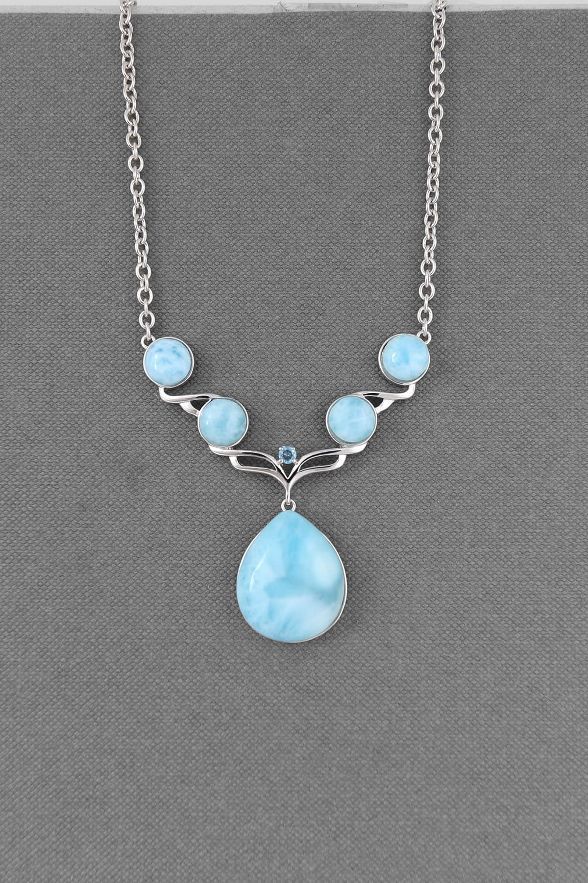 Silver chain encrusted by genuine small blue topaz 2.5mmx1, with a dropped larimar pendant. Genuine main larimar 8mmx4 round on chain and 19x22 big pear on pendant. Chain length 18 inche. Lobster crab closure. Pendant size 23x20mm.