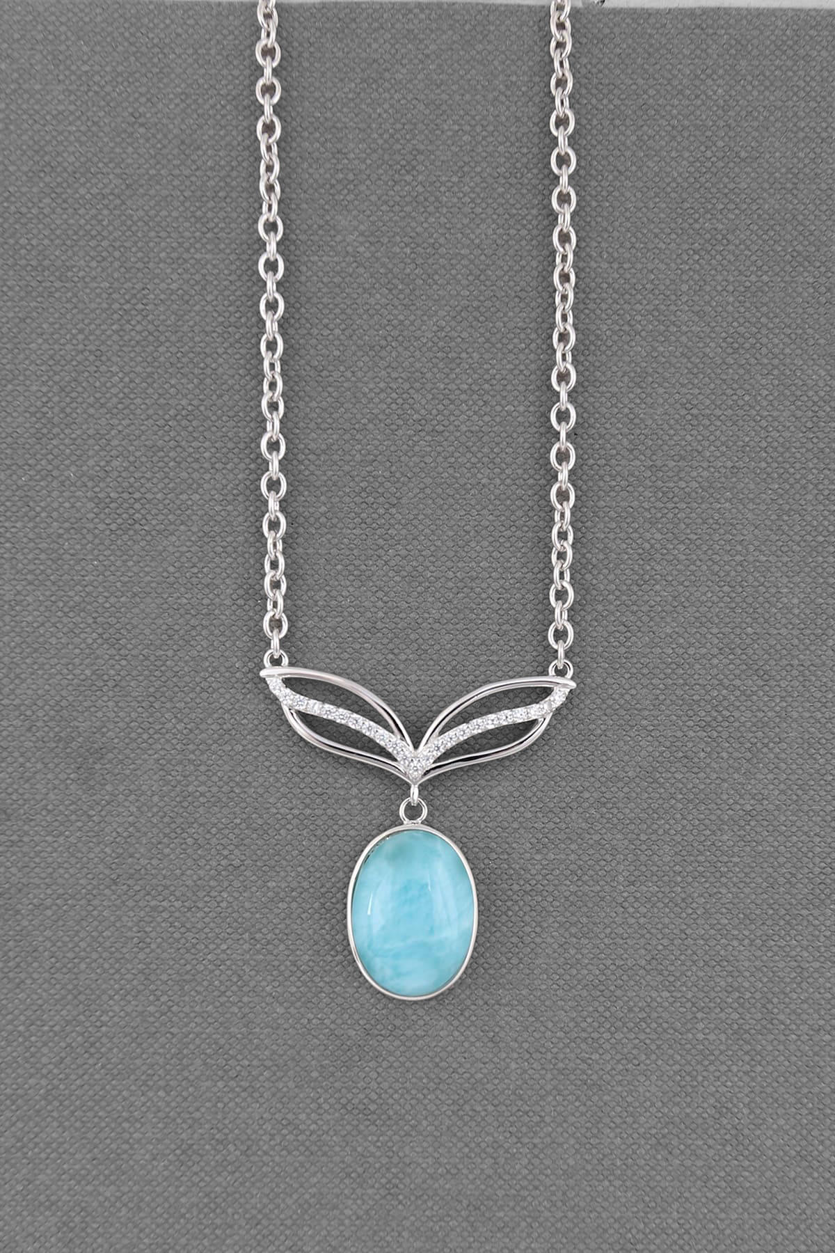Sterling silver chain, rhodium plated, decorated by small white zirconias 1.5mmx23pcs and genuine larimar pendant drop. Larimar stone13x18mm oval. Chain length 18 inches with lobster crab closure. pendant size 15x20mm.