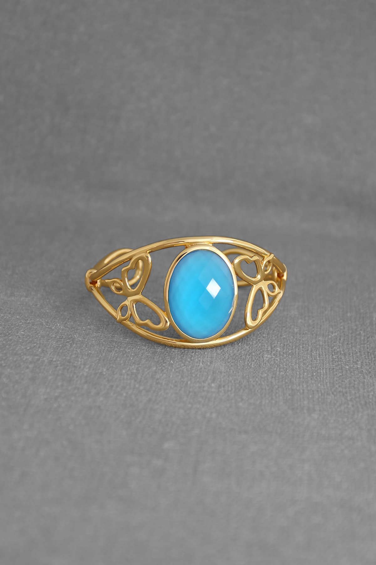 Description : Filigree metal bangle cuff, with a large sky blue glass gem centrepiece,
