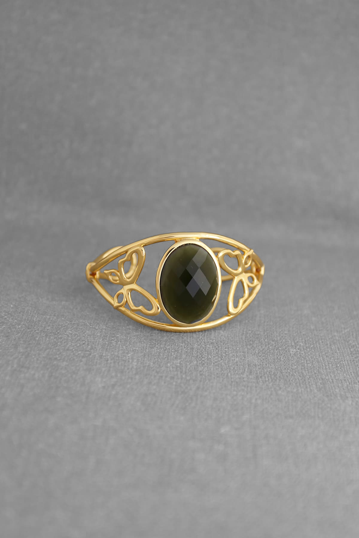 Description : Filigree metal bangle cuff, with a large cool smoky glass gem
