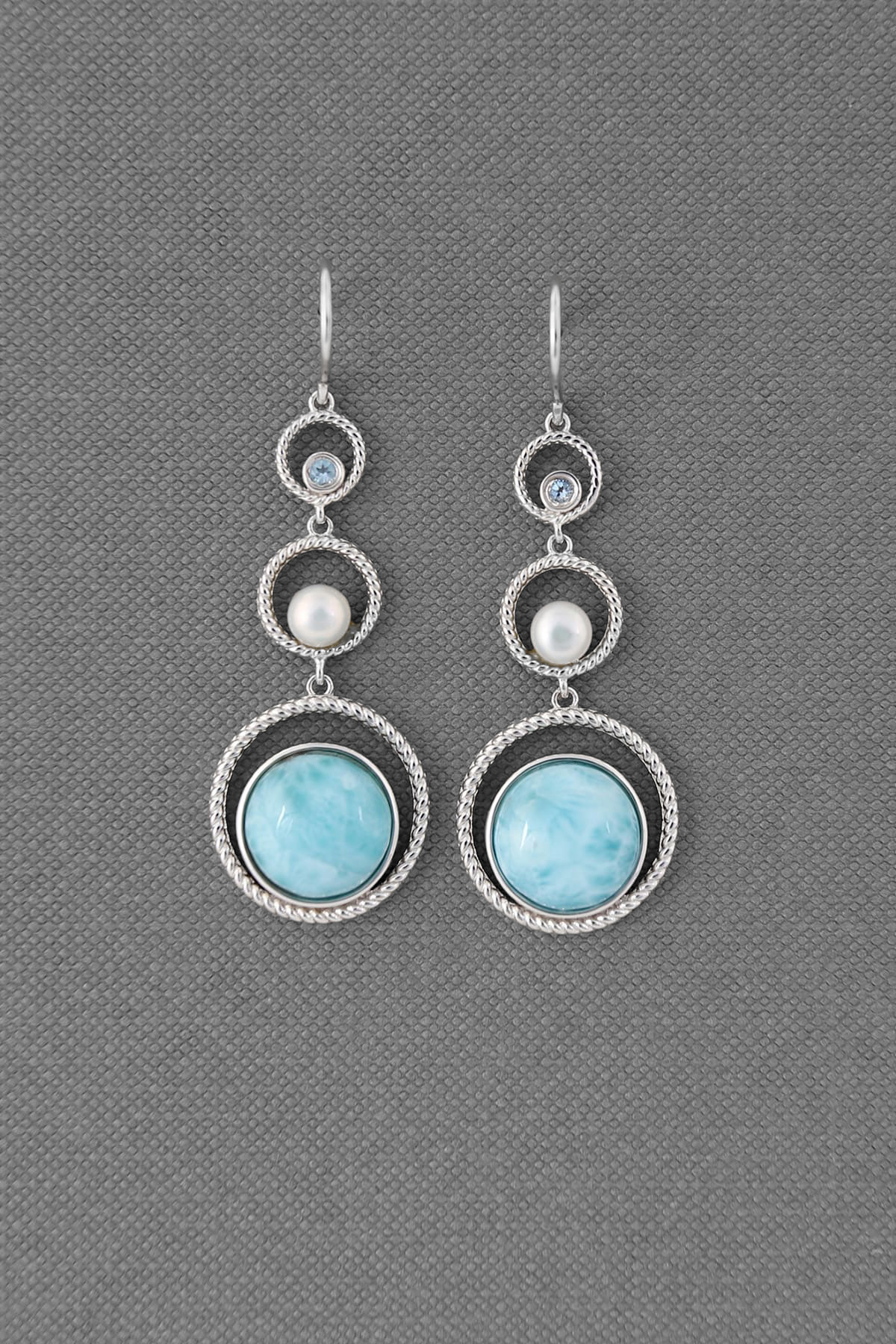Silver hooked earrings, rhodium plated, genuine Larimar 12mmx2, pearl 4mmx2 and blue topaz 3mmx2 round. Item size 19x56mm. matching pendant # 98-46.