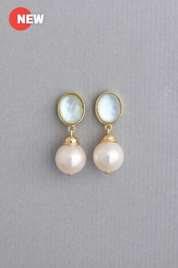 Stone sizes : Radiant-cut color glass gem 8x10 mm oval+genuine white pearl bead 10 mm dia.